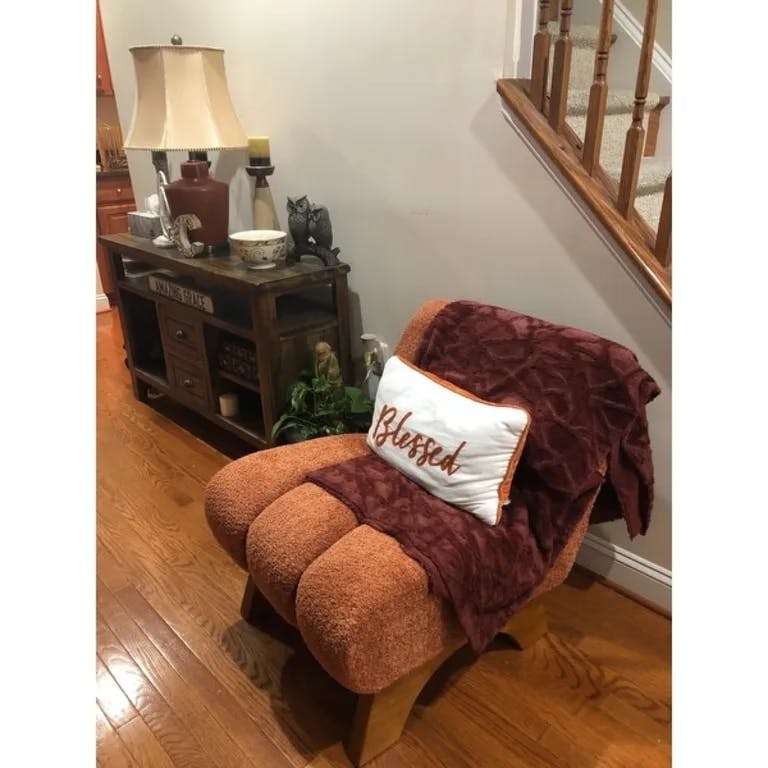 Experience plush comfort and modern allure with our Sherpa-upholstered accent chair. Its thickened sponge filling and solid wood legs exude both luxury and function, while thoughtful blanket-foot pads protect your floors.