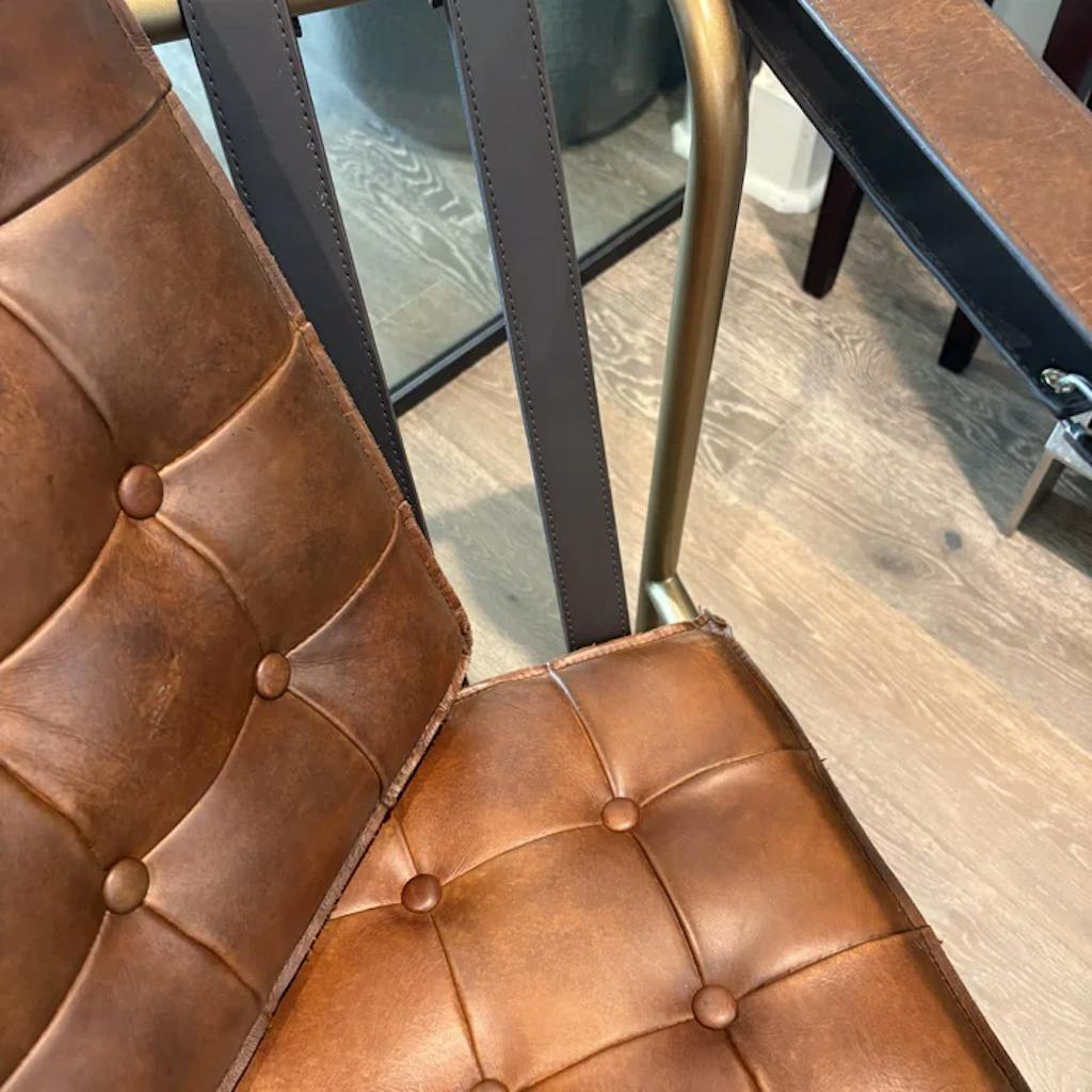 Distressing Leather Craftsmanship (Purposely made to look aged or worn): The armchair is made of genuine leather with a special distressed treatment, showcasing the delicate texture. The cracking & creasing will soften with age! It rests on a square metal frame, which makes it more stable, exceptionally sturdy, and built to stand the test of time.