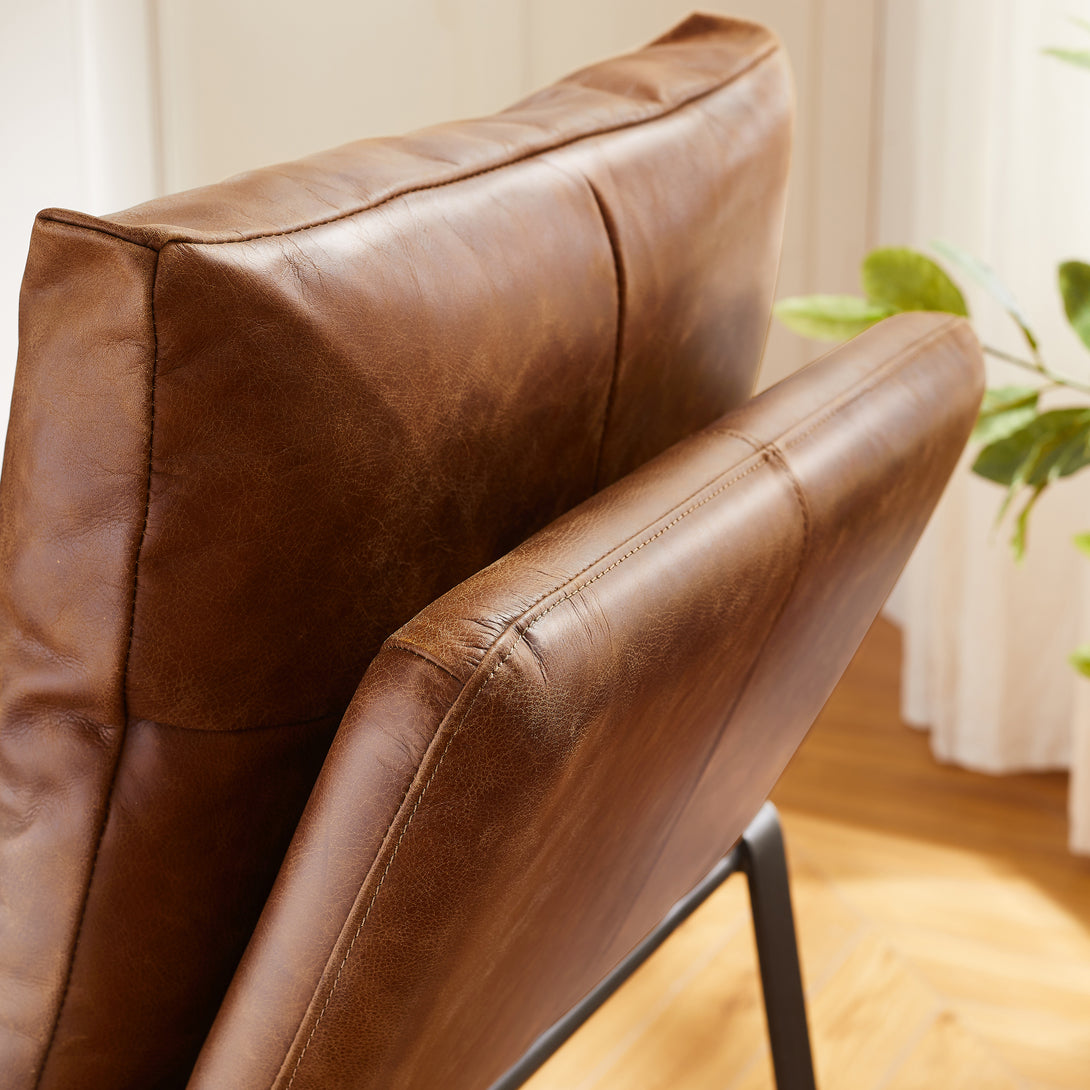 Sink into mid-century luxury with our unique accent chair, adorned in top-grain vintage leather that ages like fine wine. Filled with full plush down feathers and a thick cushion, each chair is an individual masterpiece.
