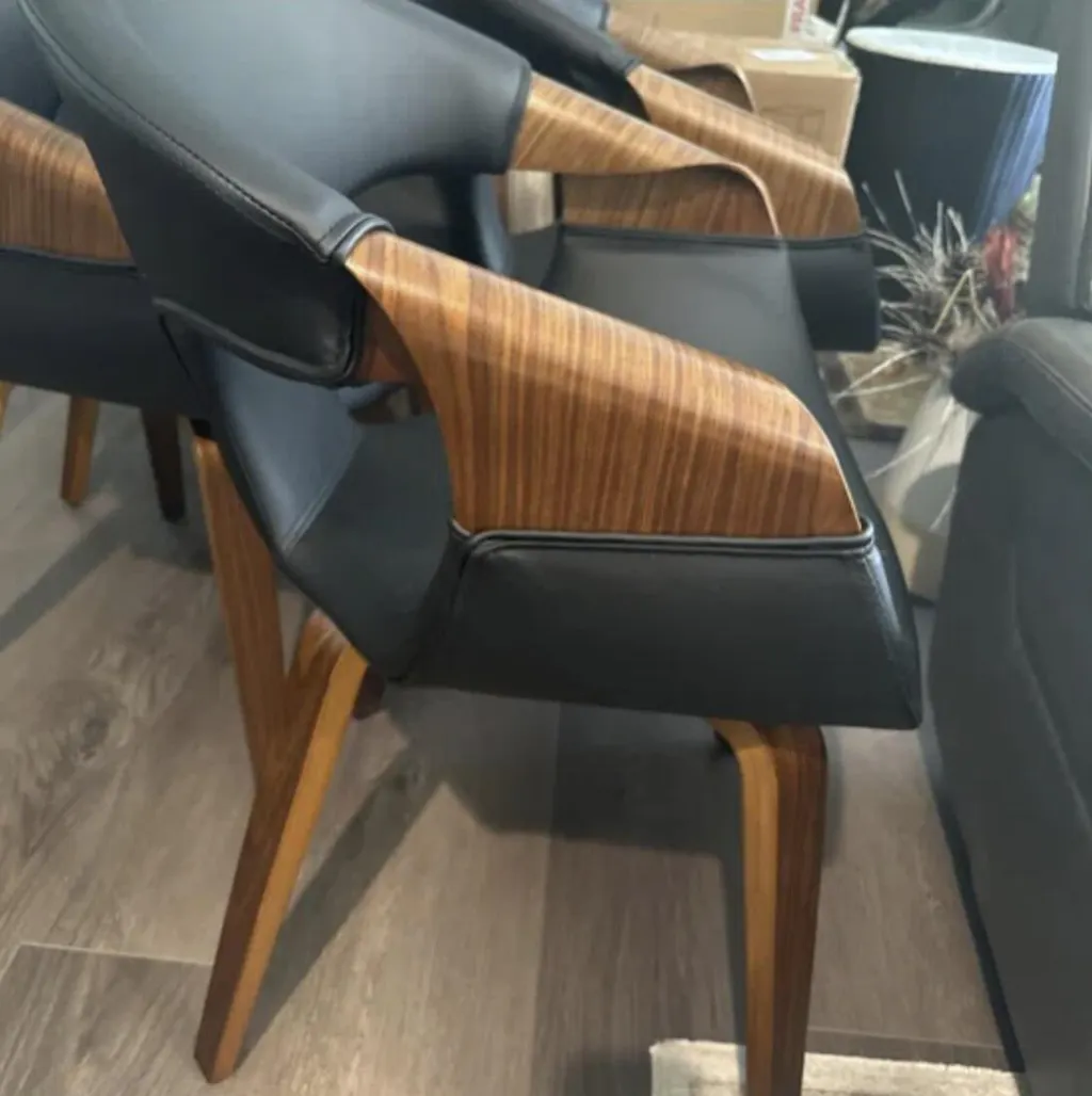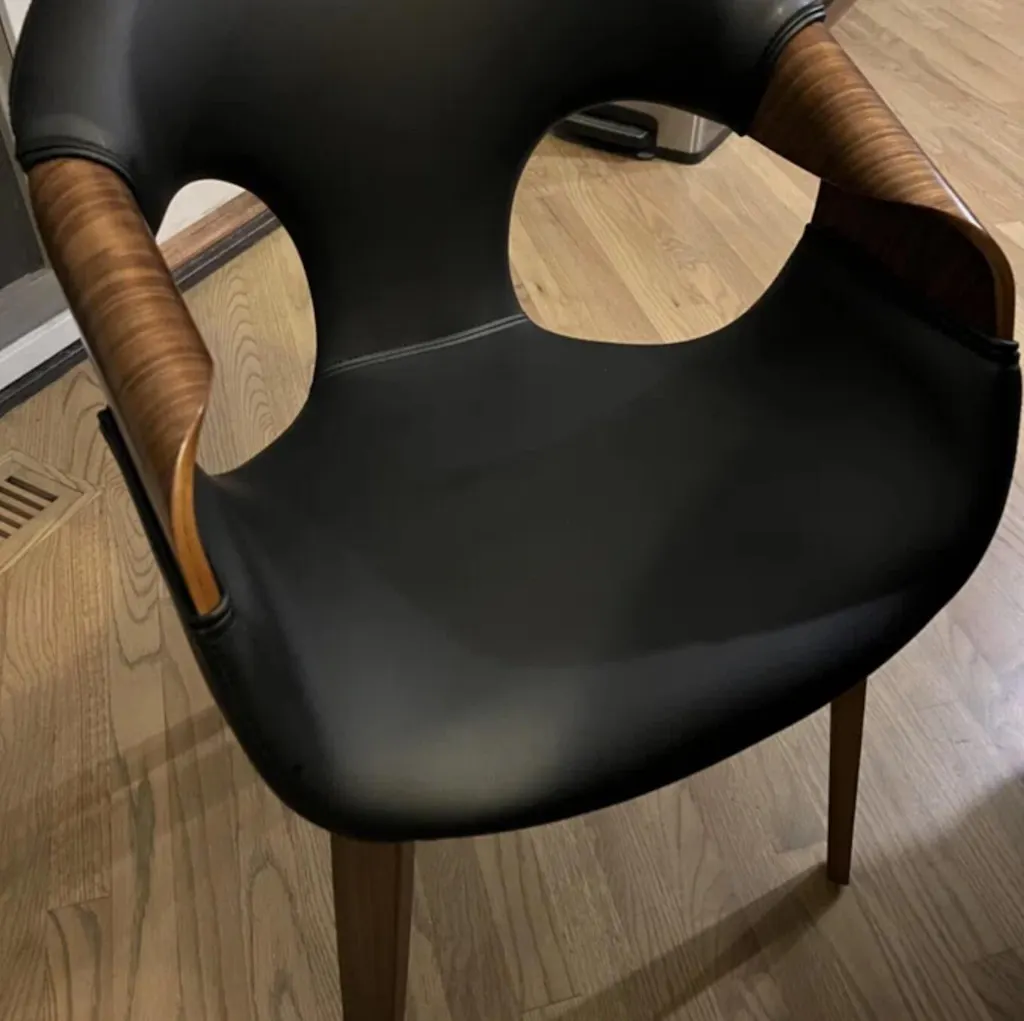 Indulge in sleek sophistication with this chair, featuring unique wooden hand-shaped armrests and a modern leather aesthetic! The angled legs offer stability, while the adjustable feet ensure perfect balance. It epitomizes both function and high-end style!