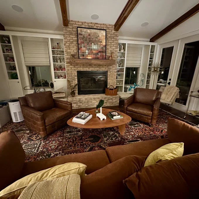 Bought this in the camel color and it is fabulous. The style looks designerhigh end. The leather is great quality, and it's comfortable to sit in! The arms are a little low for a natural arm height, but that is it!