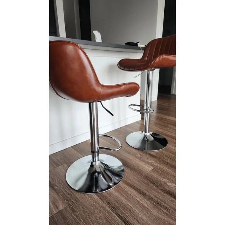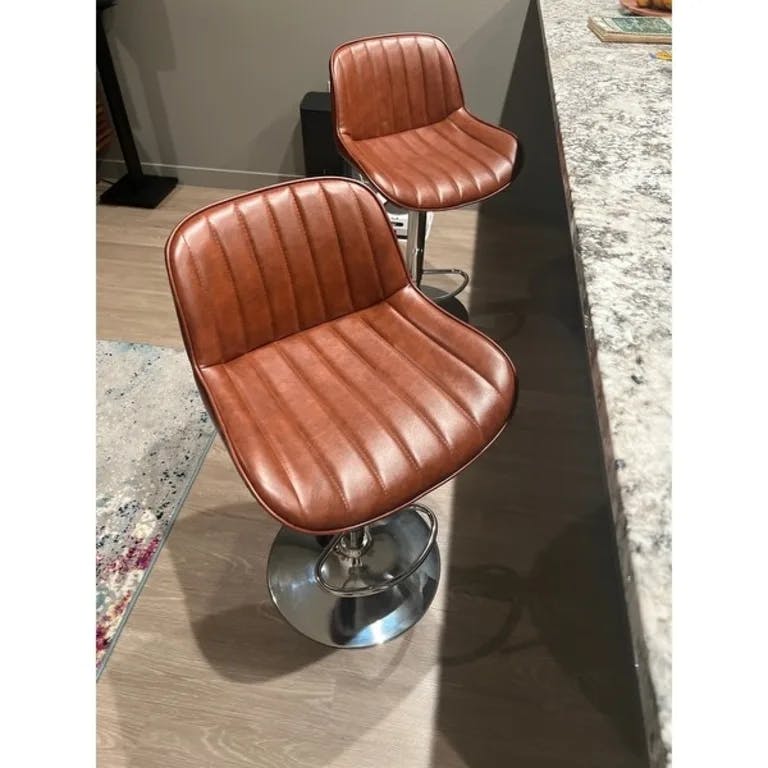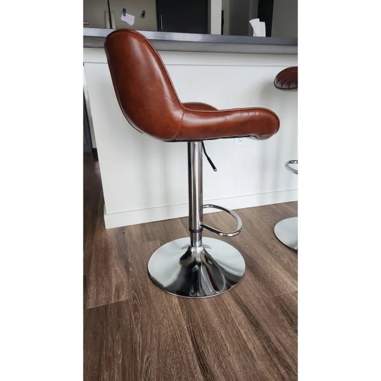 For the price, these two bar stools are great! Great coloring on the dark brown leather and the stainless steel came in great condition with no dings or scratches. Very easy to assemble and the adjustable height was perfect for our kitchen island. Overall, the stools are still working great.