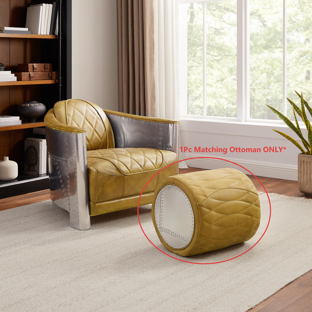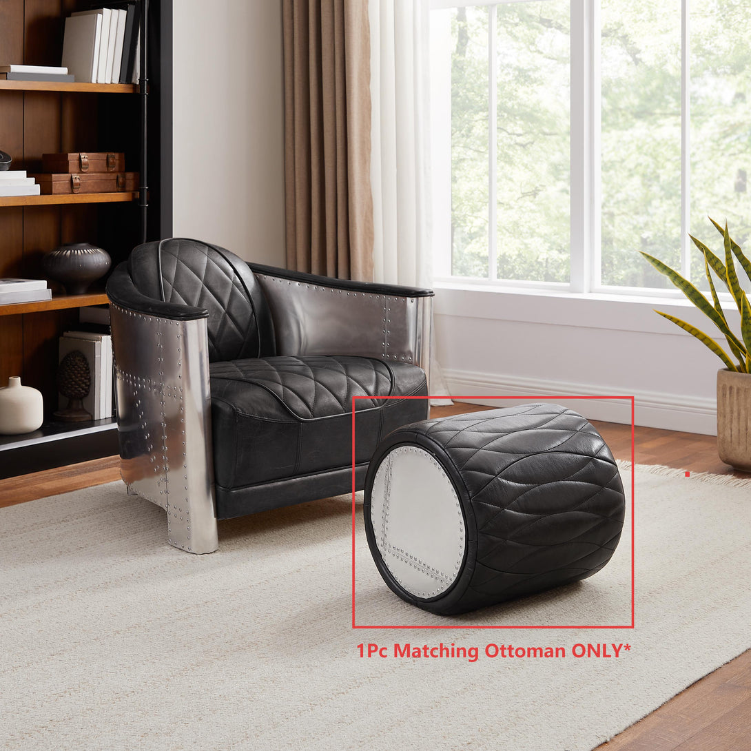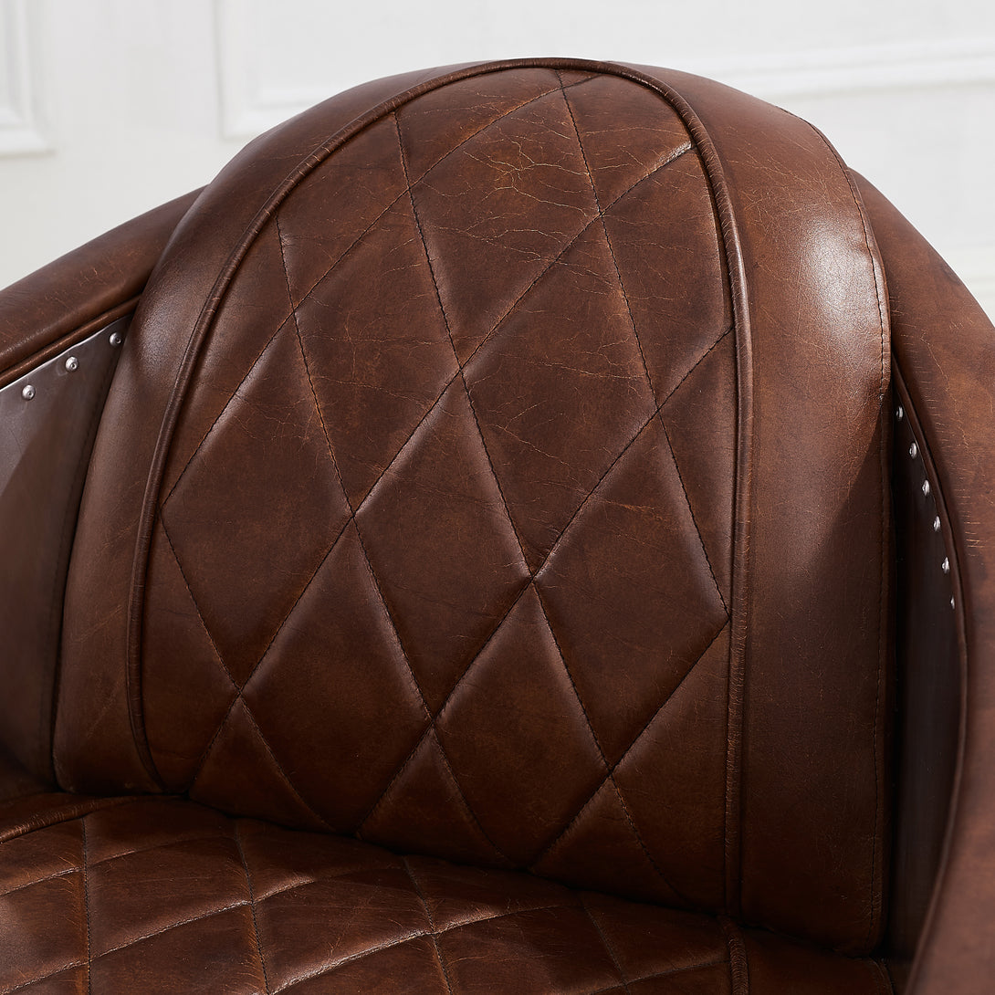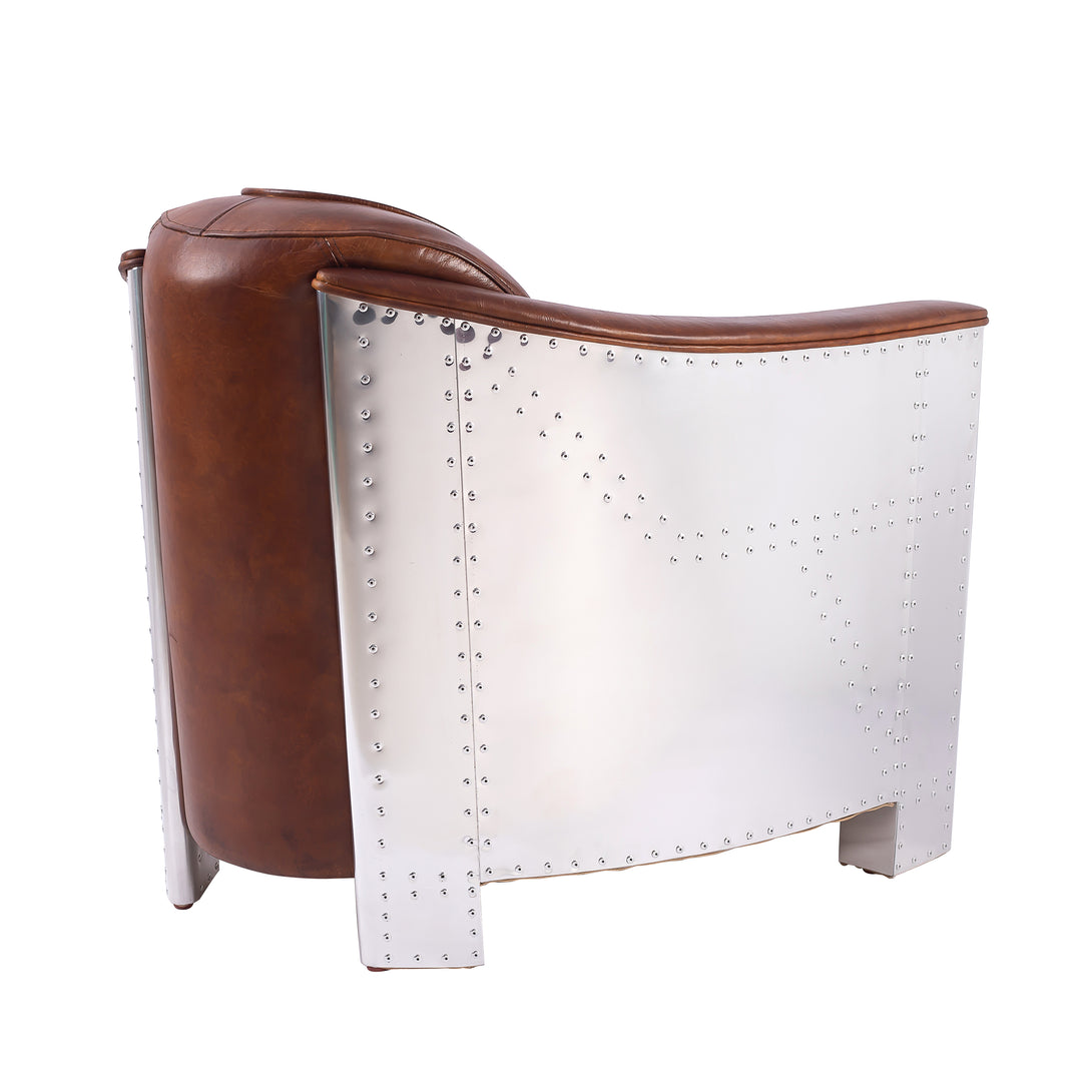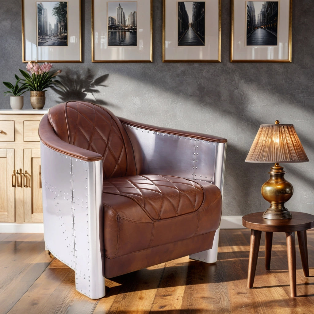 Indulge in the fusion of luxury and adventure with this aviator-inspired accent chair, featuring sumptuous tufted leather, gleaming metal accents, and rivet detailing for a bold statement in any sophisticated space.