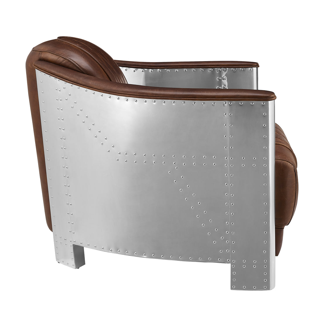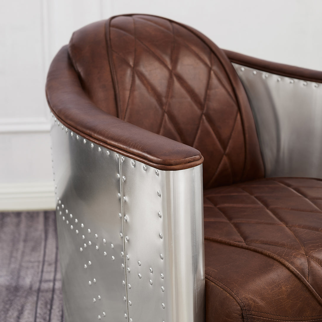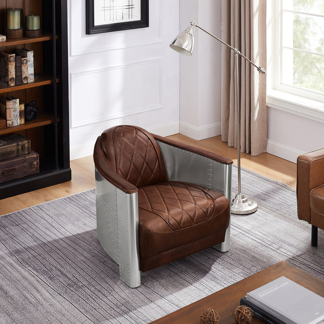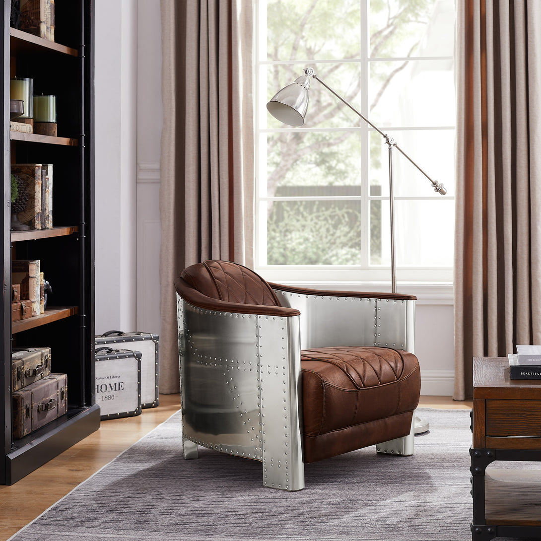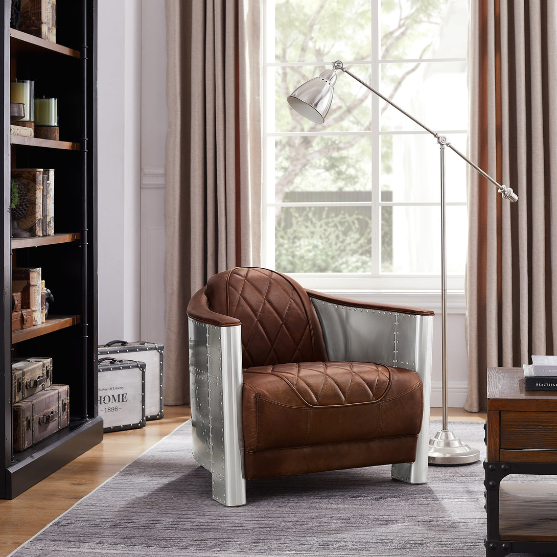 Art Leon Top Grain Aviator Genuine Leather Accent Chair with Aluminum Patchwork, Medieval Industrial Design