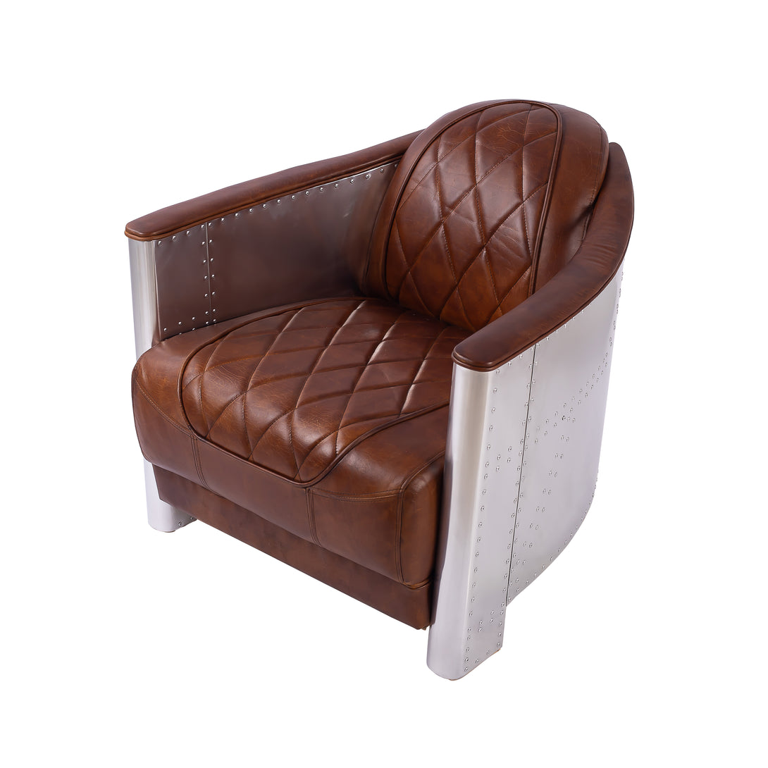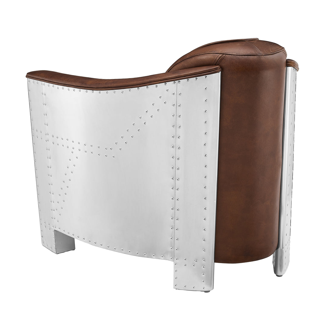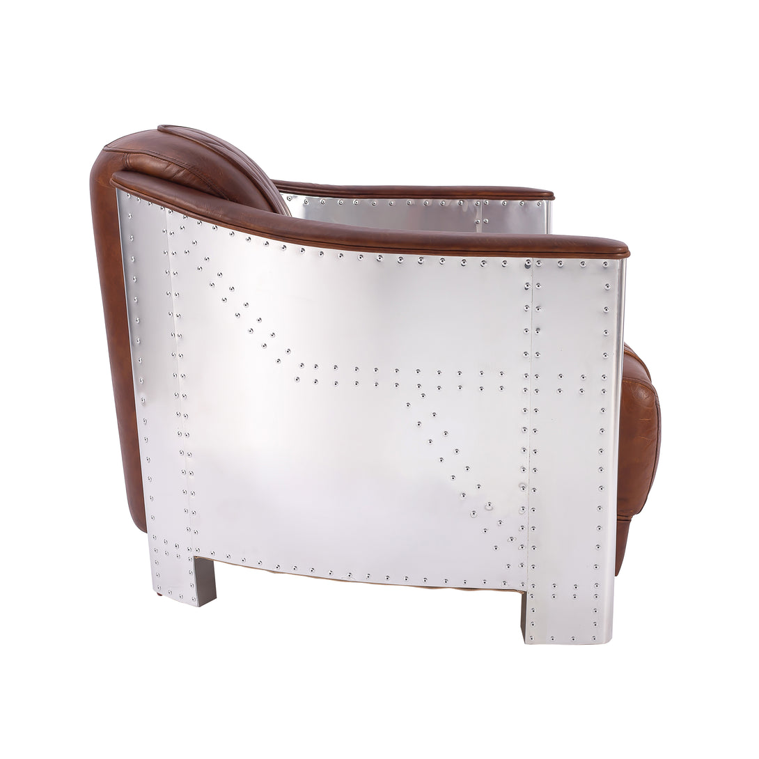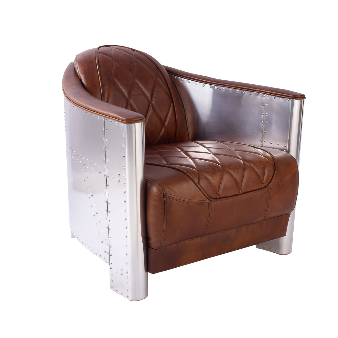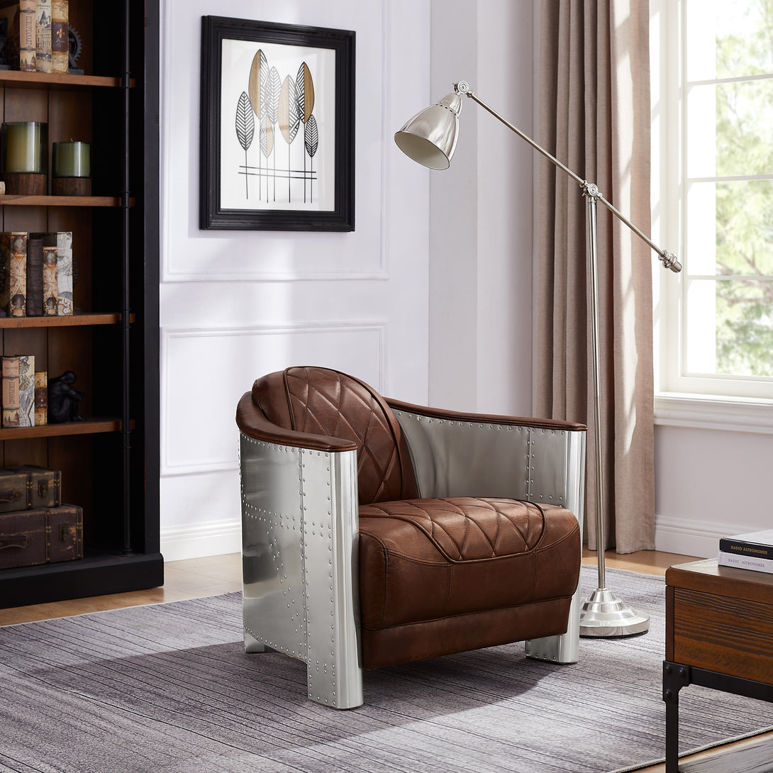 Art Leon Top Grain Aviator Genuine Leather Accent Chair with Aluminum Patchwork, Medieval Industrial Design
