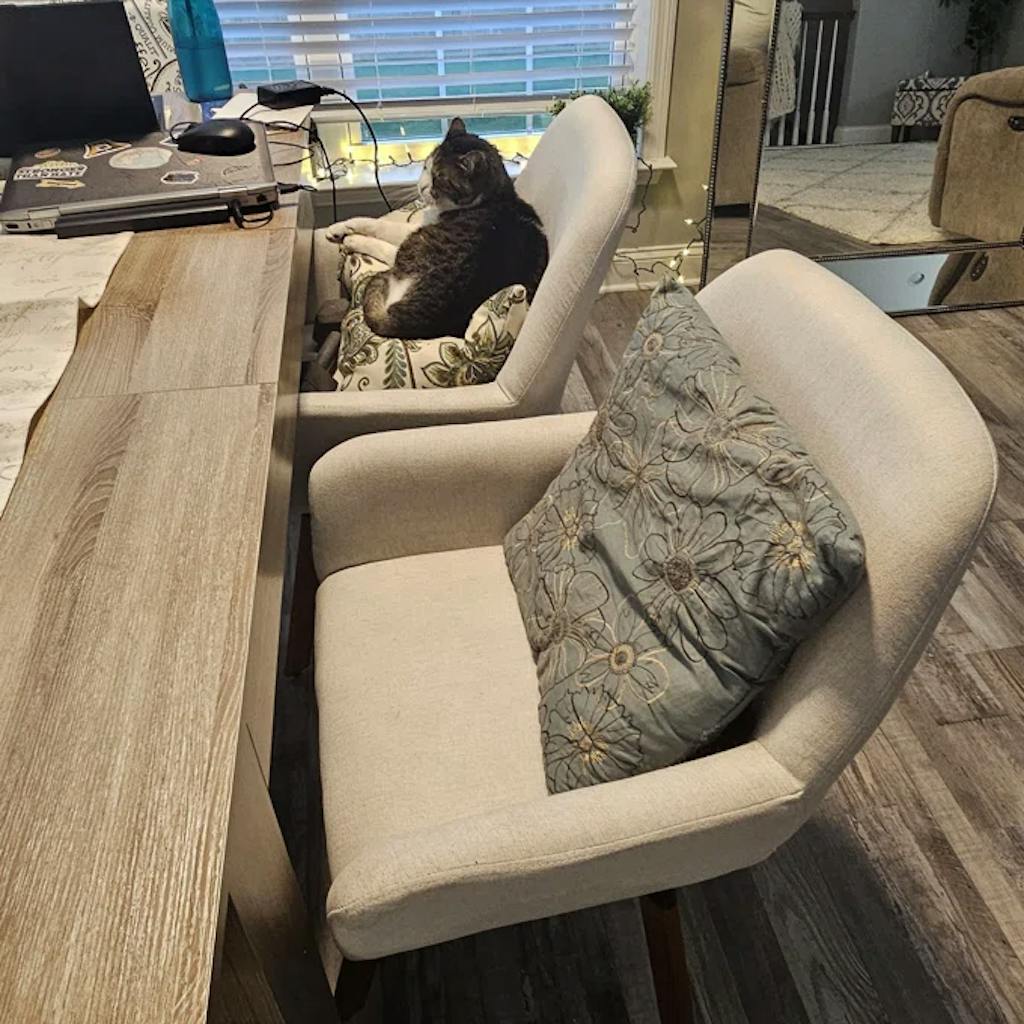 It is upholstered in linen fabric, a natural and breathable material known for its durability and comfort. The chair is also foam padded for added comfort. The cushion and armrests are padded with high-density foam, which conforms to the shape of your body, providing a comfortable and supportive seating experience.