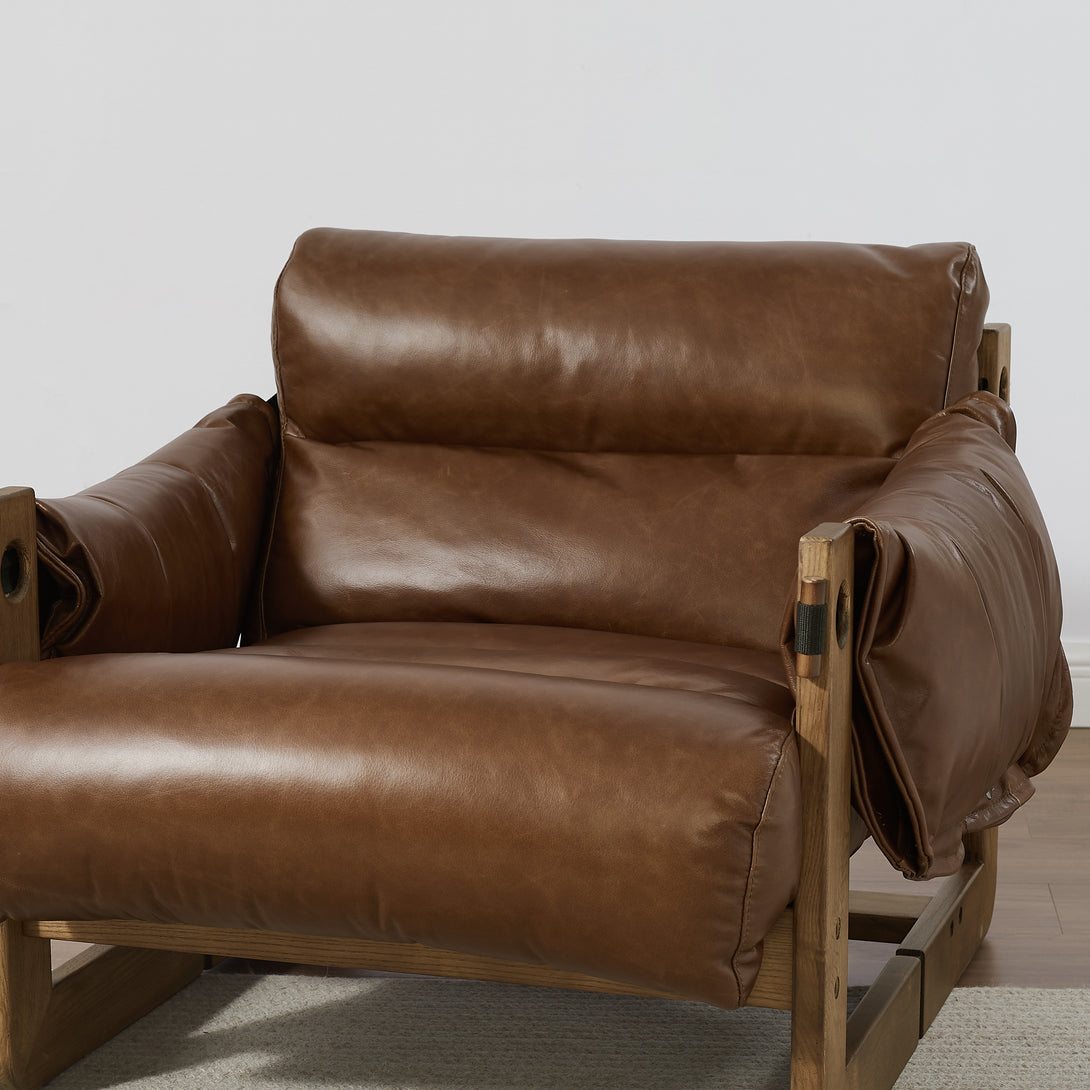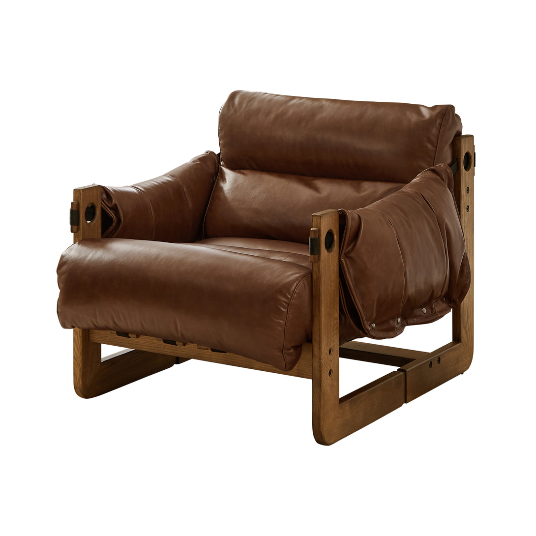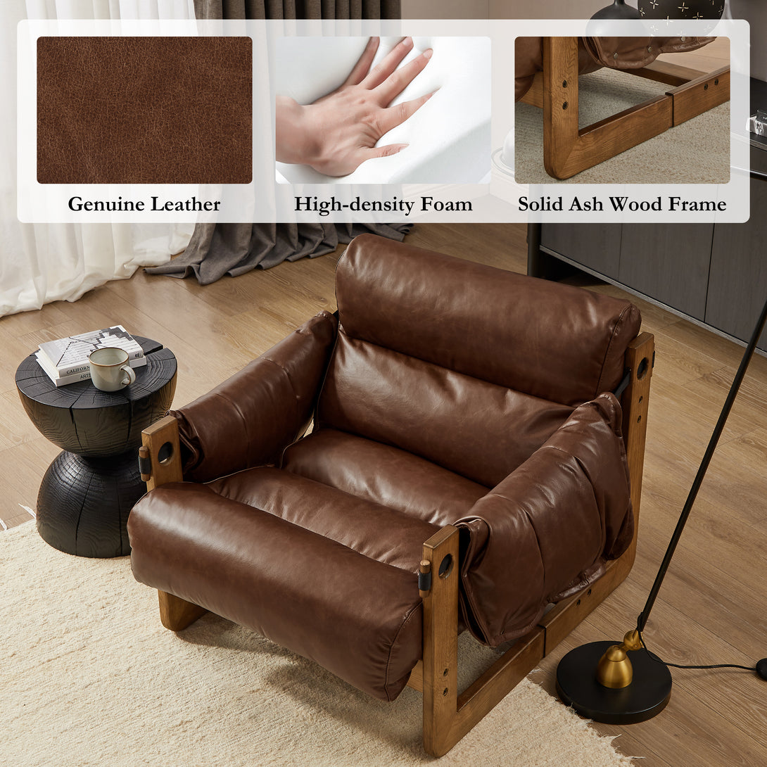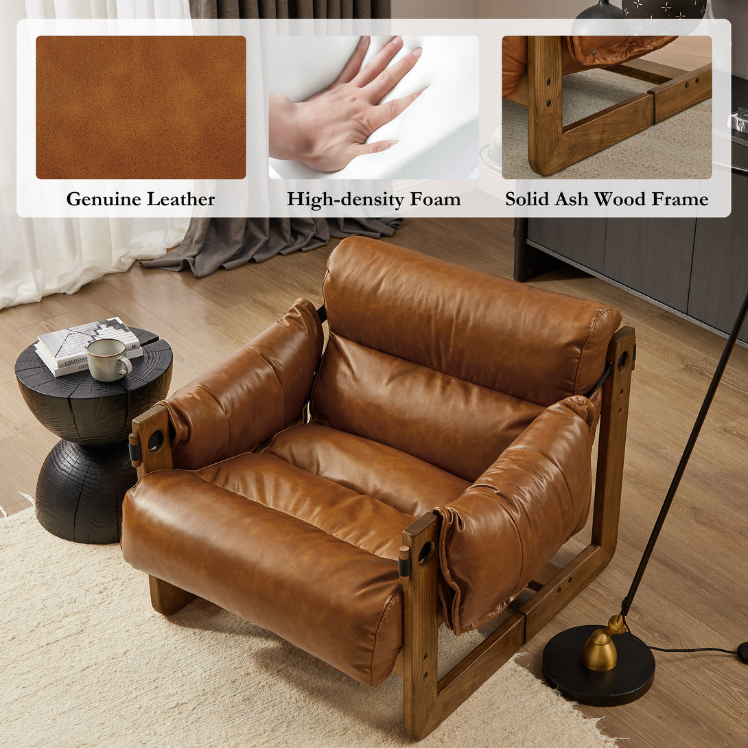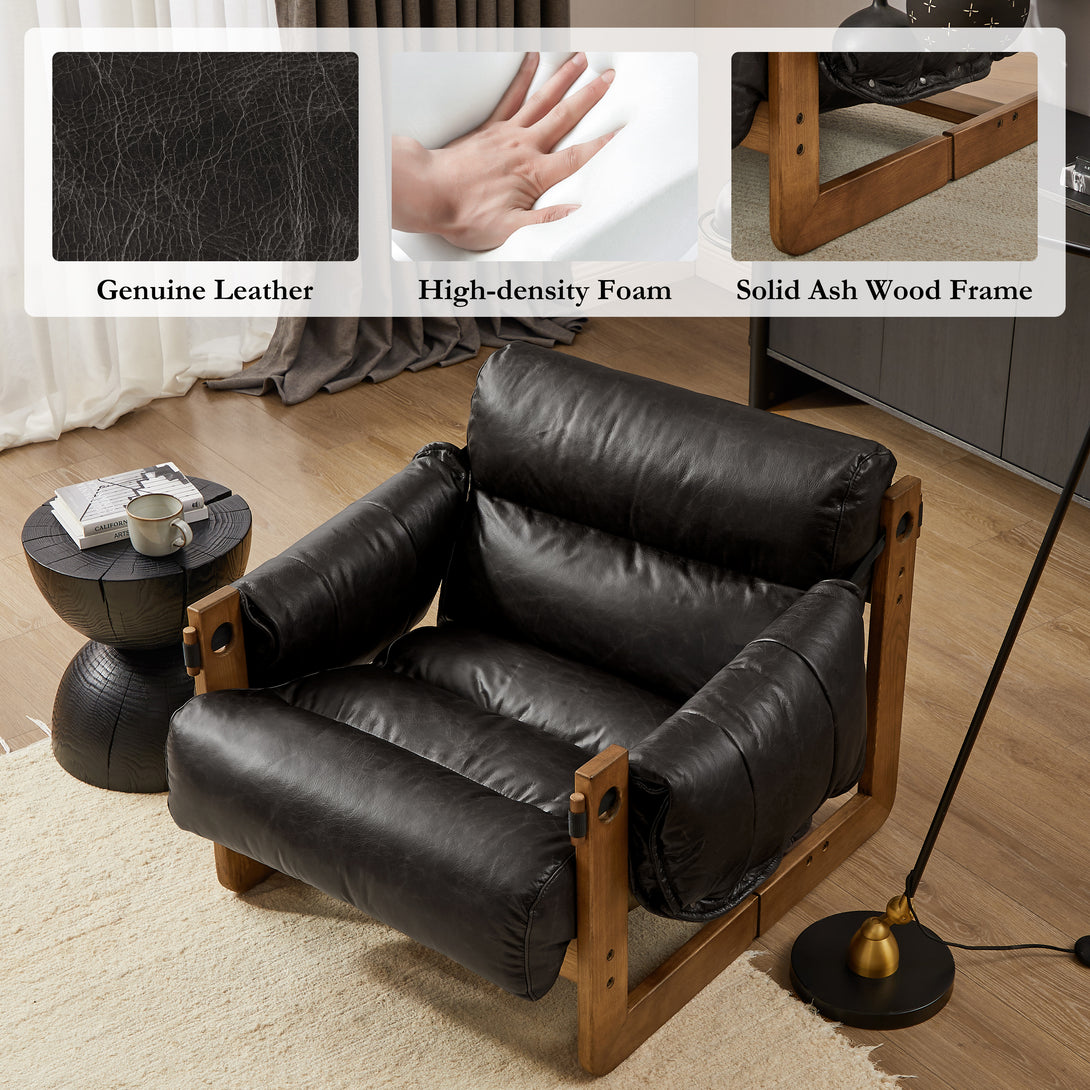 Art Leon Solid Ash Wood Leisure Chair, Top-Grain Leather Lounge Sofa with Strapped-on Cushions
