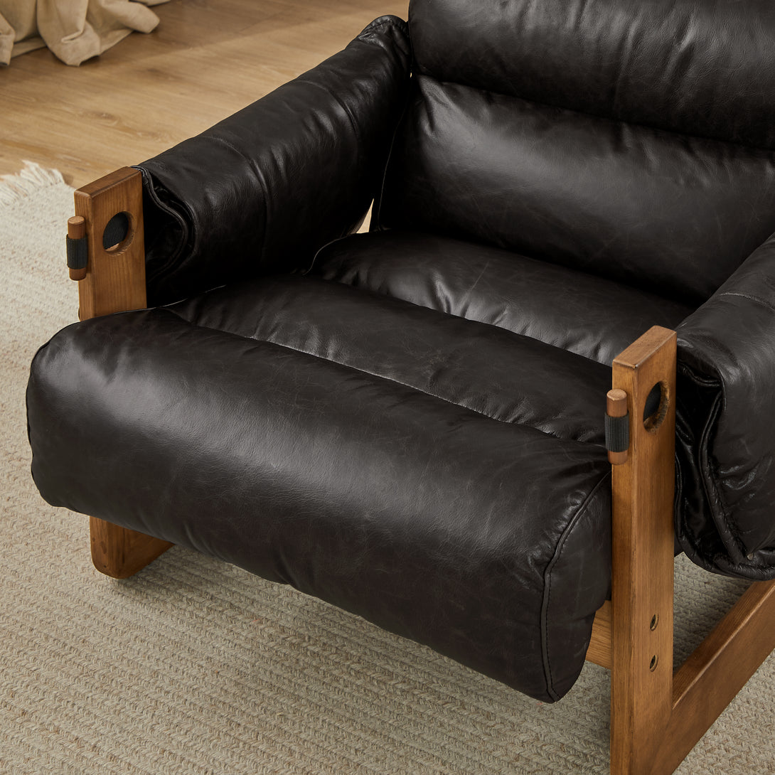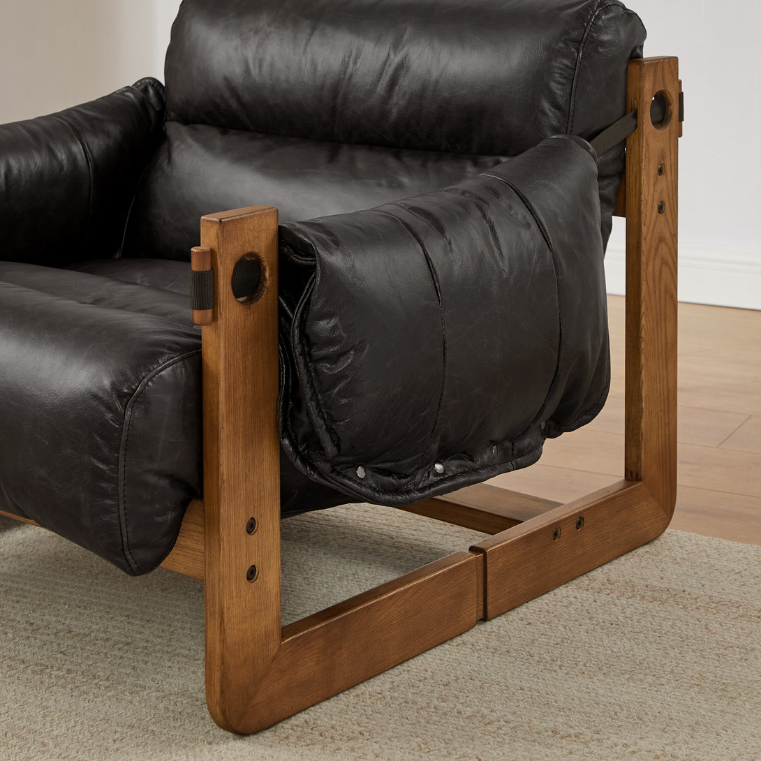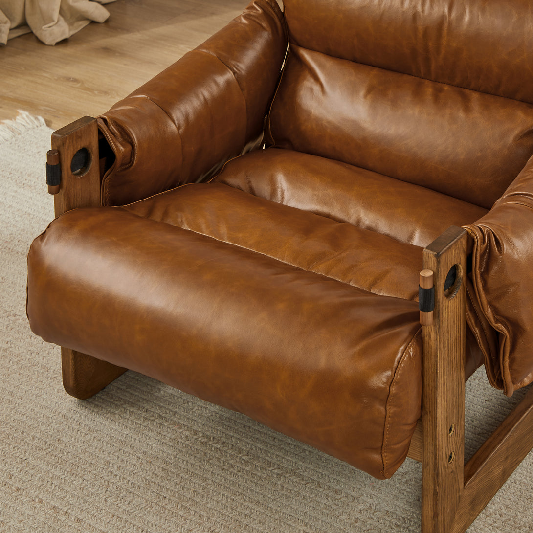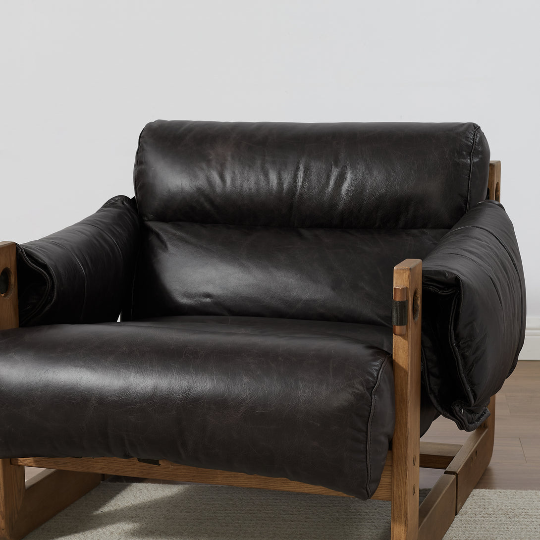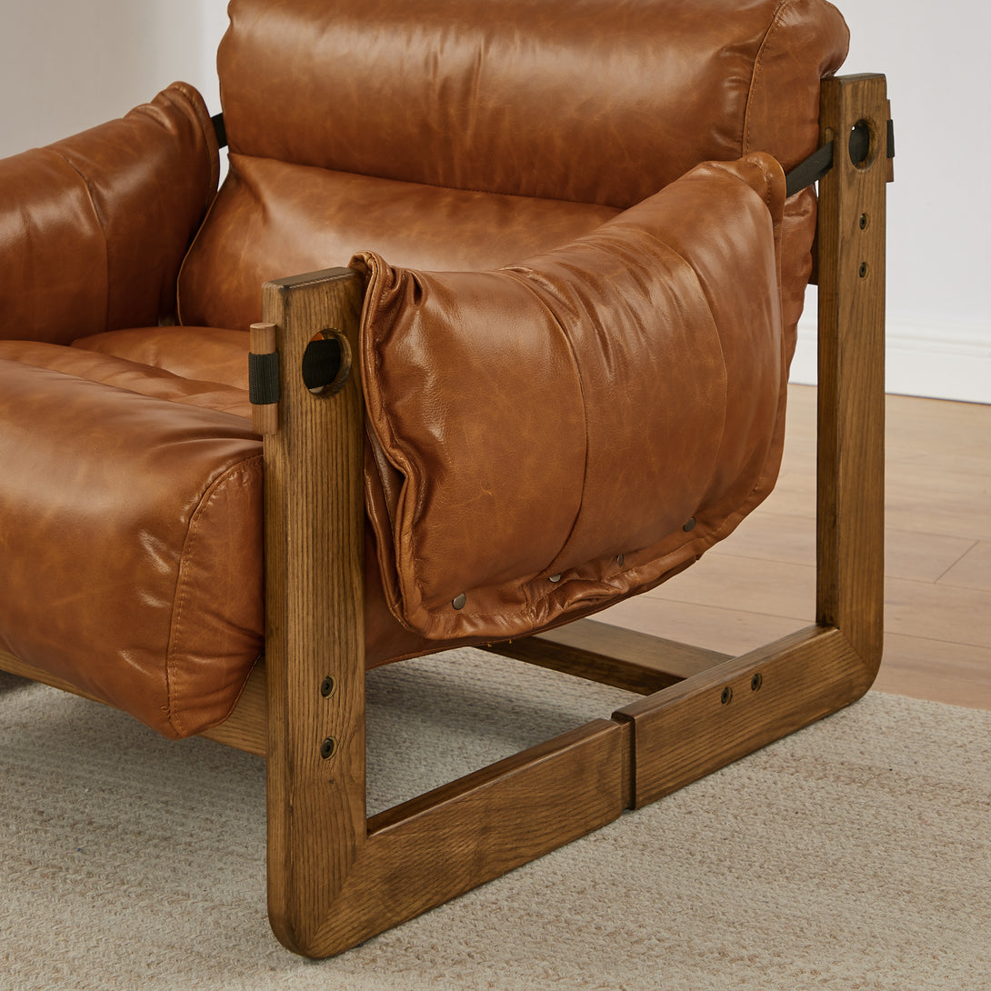 Art Leon Solid Ash Wood Leisure Chair, Top-Grain Leather Lounge Sofa with Strapped-on Cushions