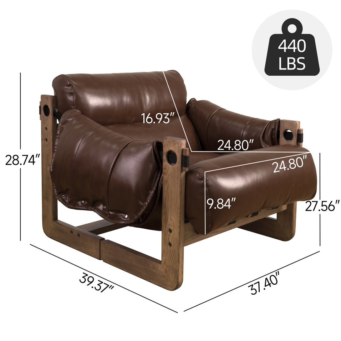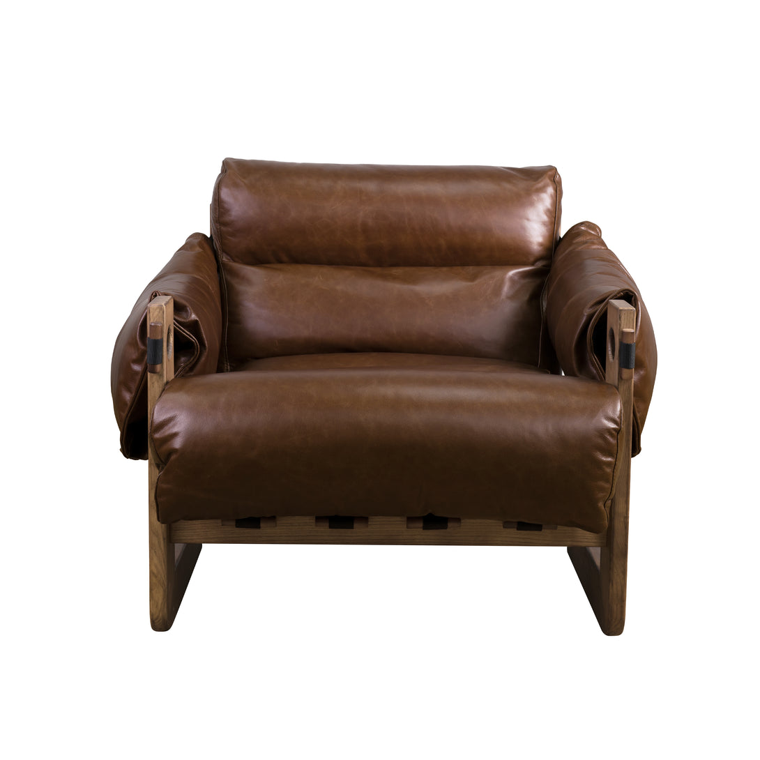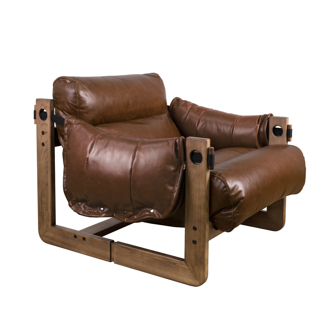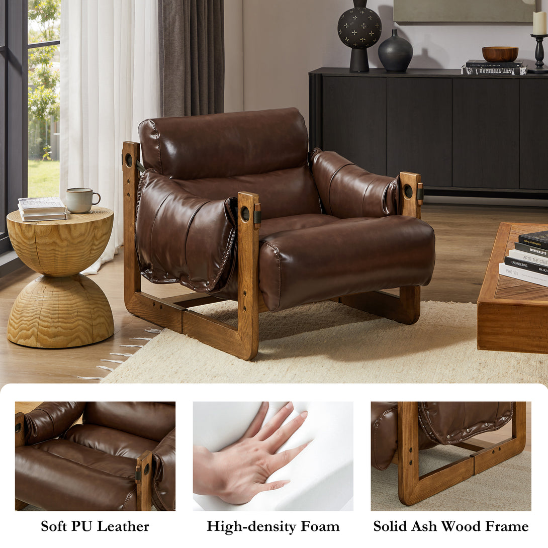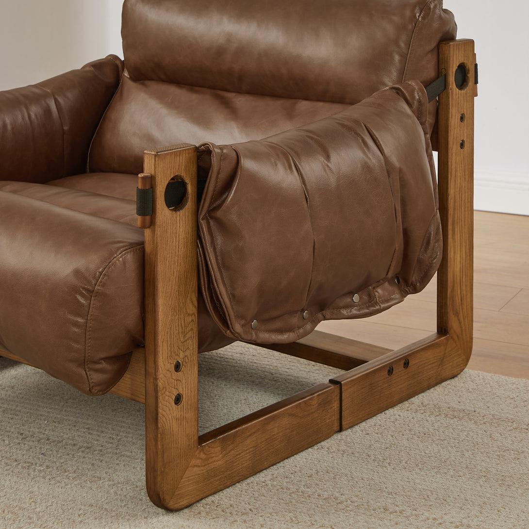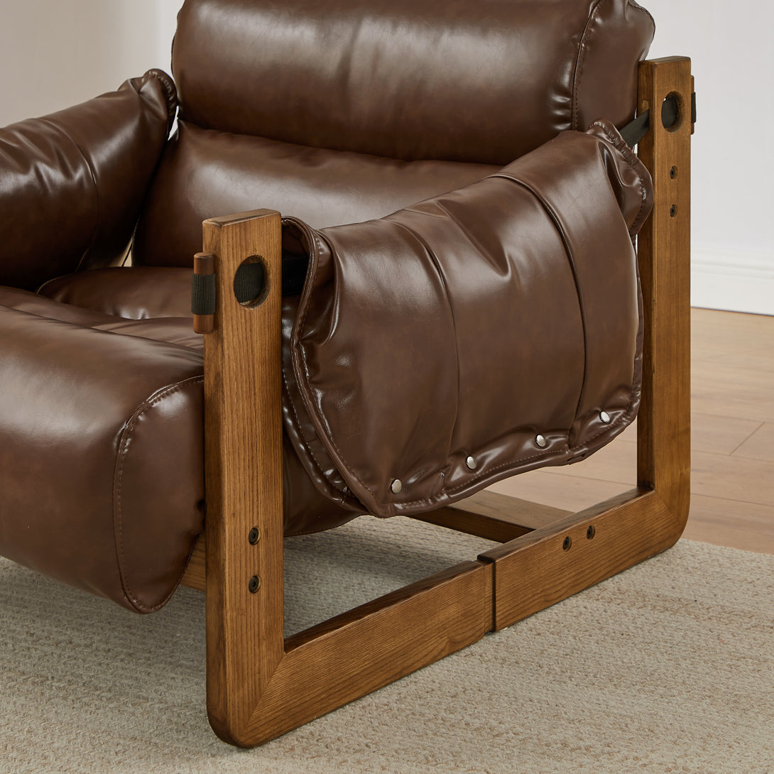 Art Leon Solid Ash Wood Leisure Chair, Top-Grain Leather Lounge Sofa with Strapped-on Cushions