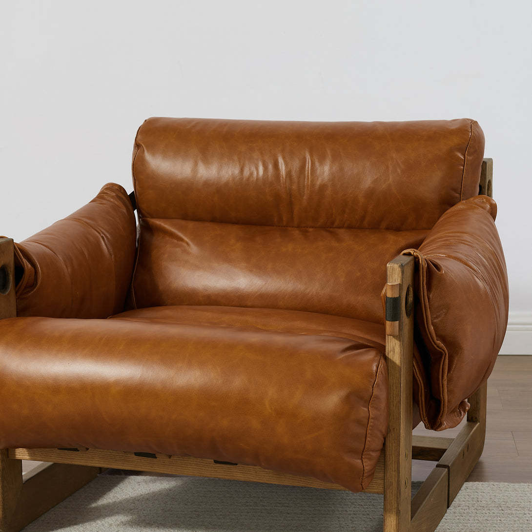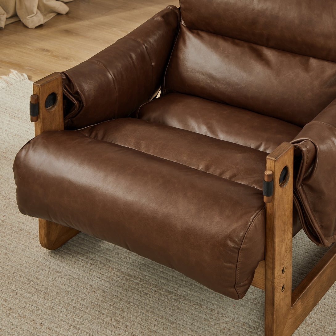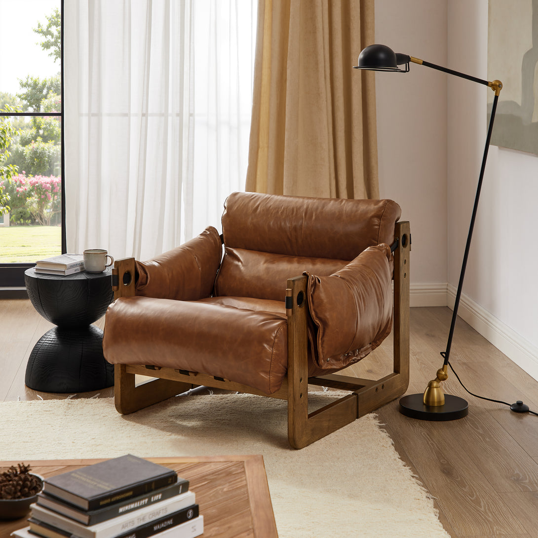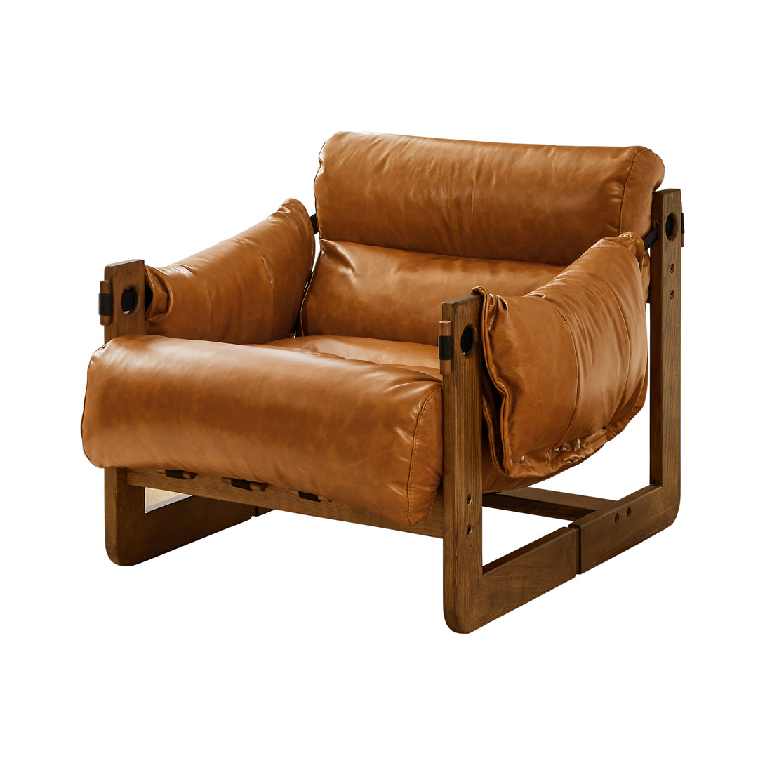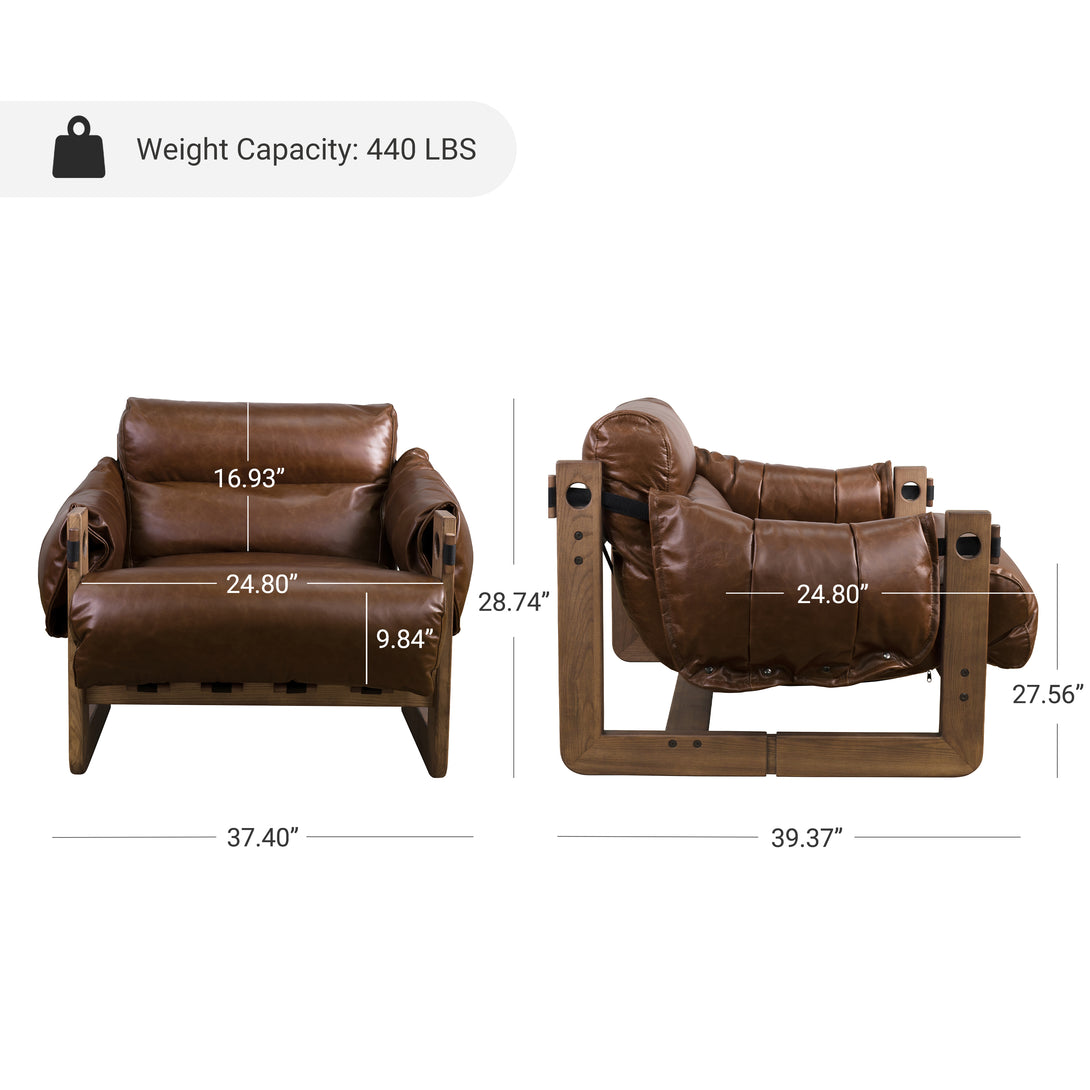 Art Leon Solid Ash Wood Leisure Chair, Top-Grain Leather Lounge Sofa with Strapped-on Cushions