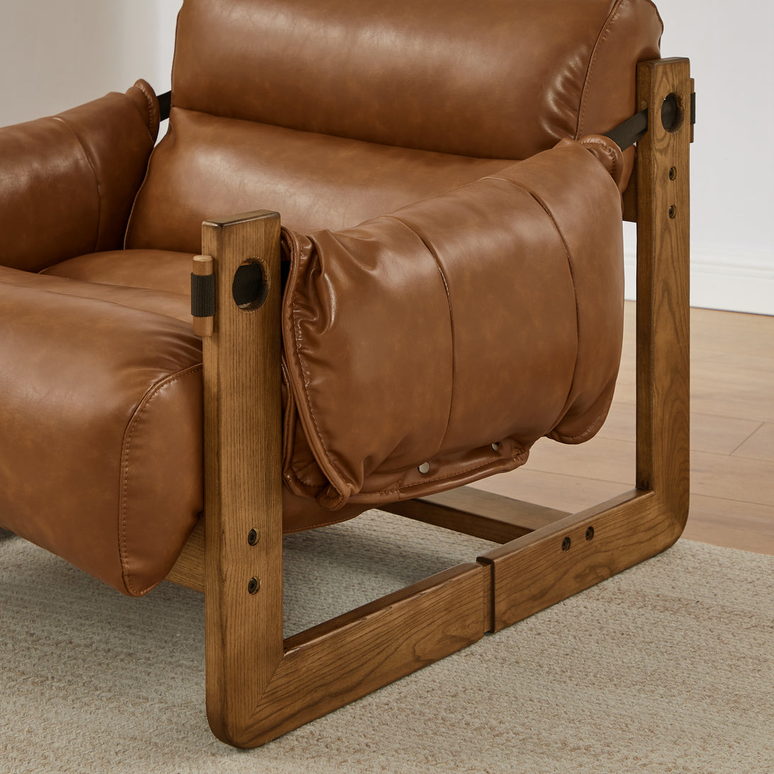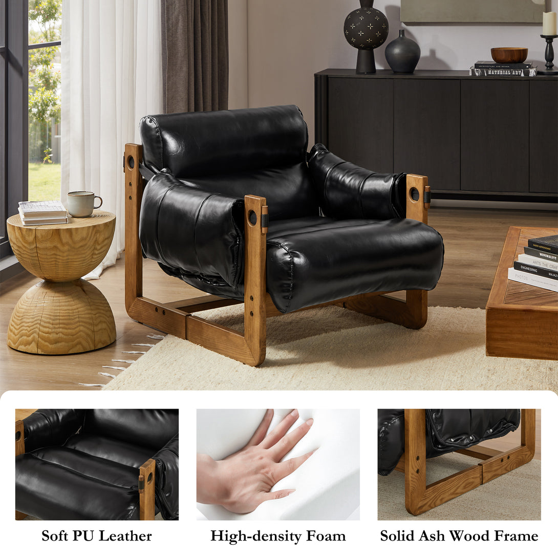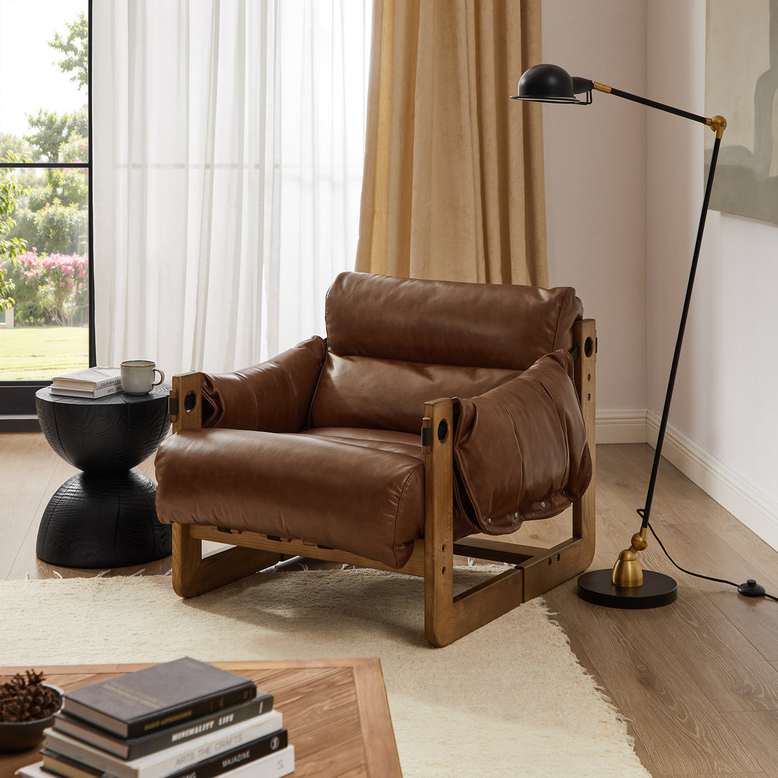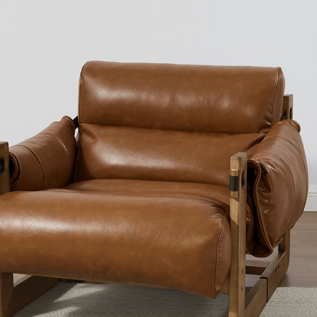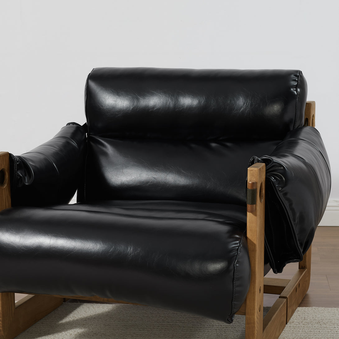 Art Leon Solid Ash Wood Leisure Chair, Top-Grain Leather Lounge Sofa with Strapped-on Cushions