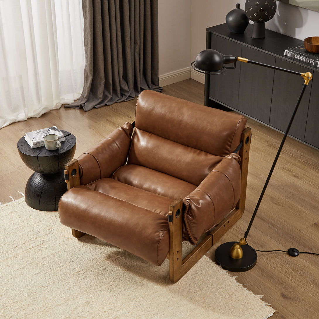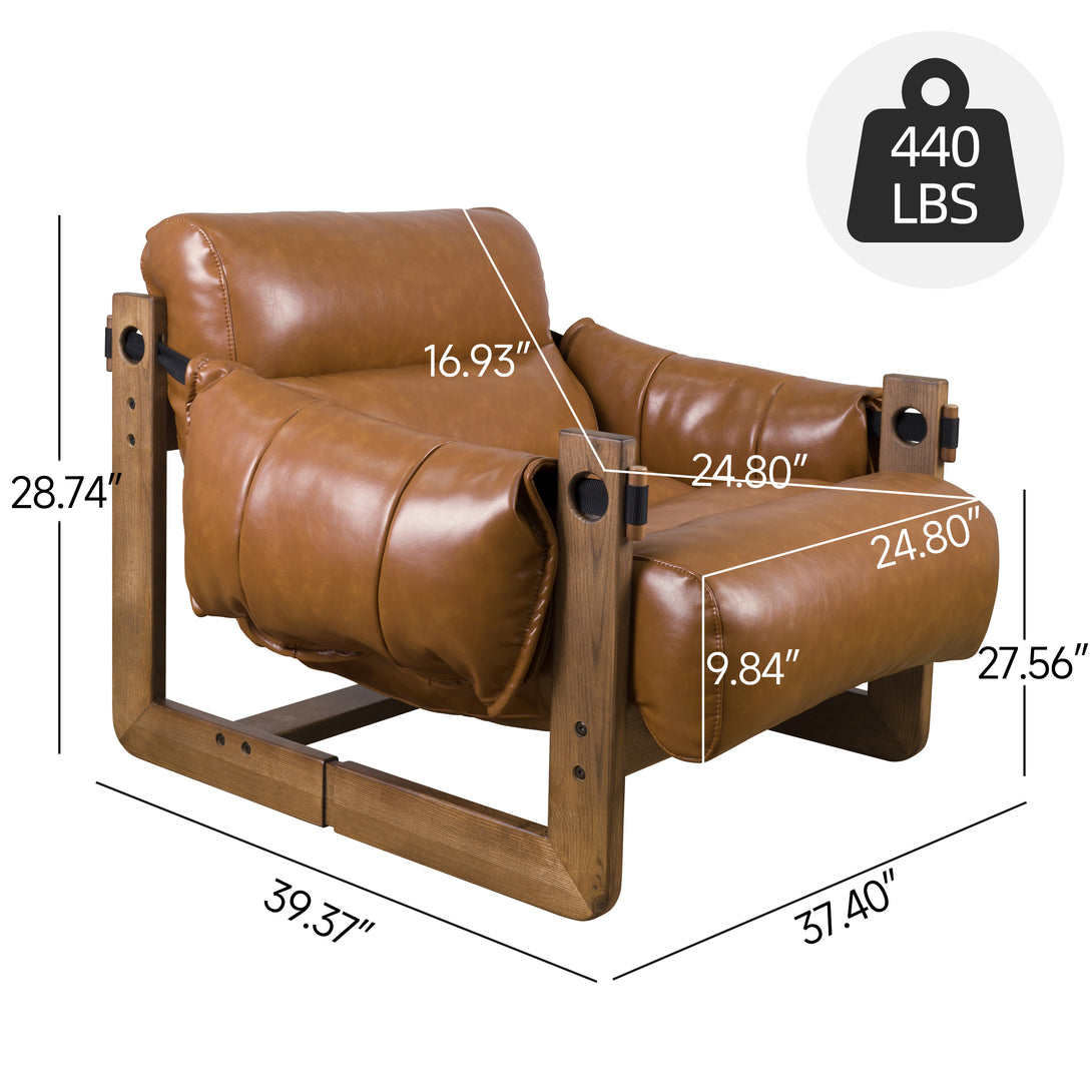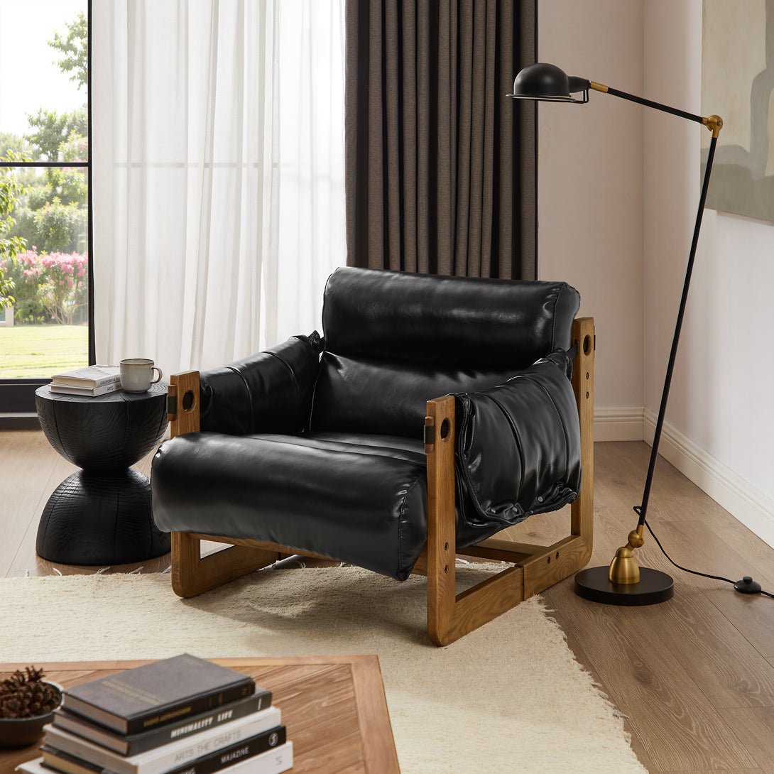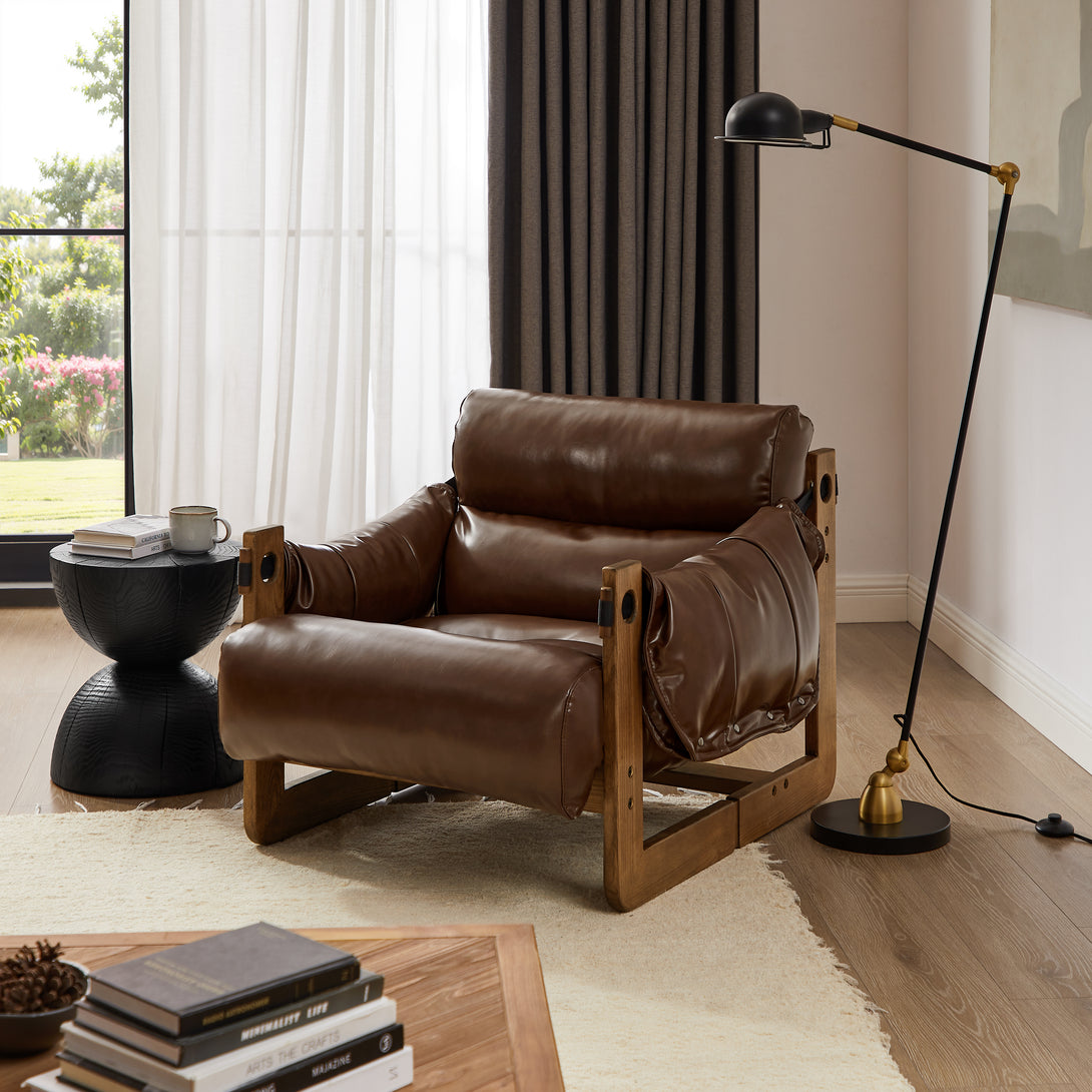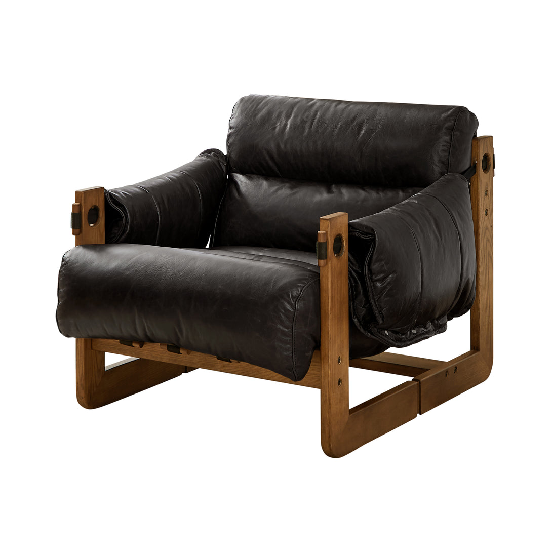 Art Leon Solid Ash Wood Leisure Chair, Top-Grain Leather Lounge Sofa with Strapped-on Cushions