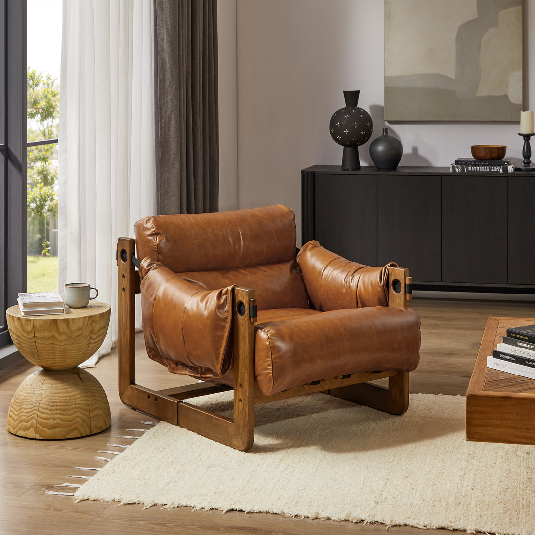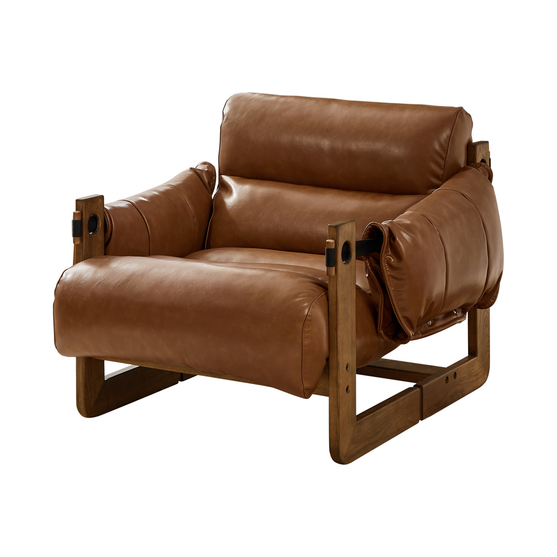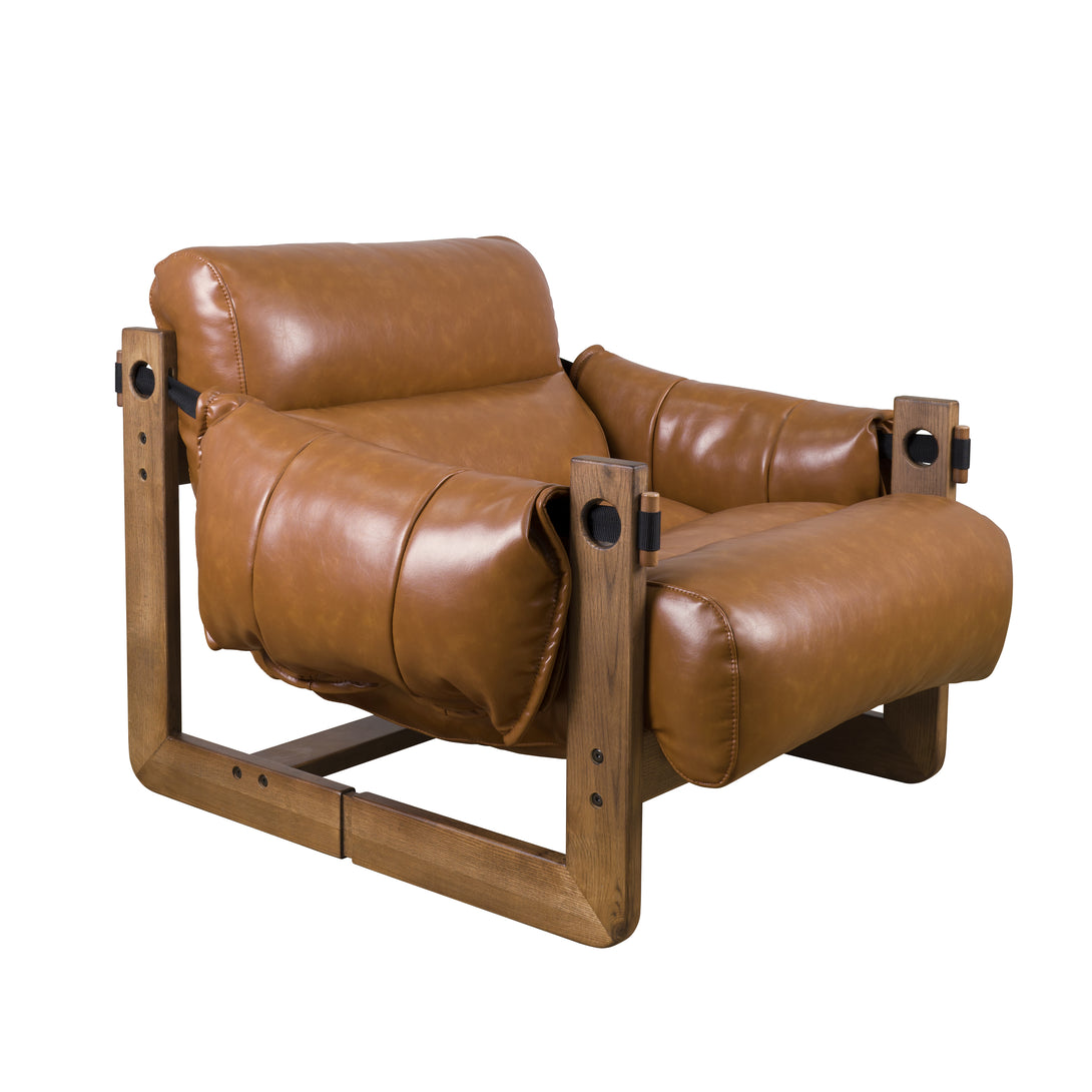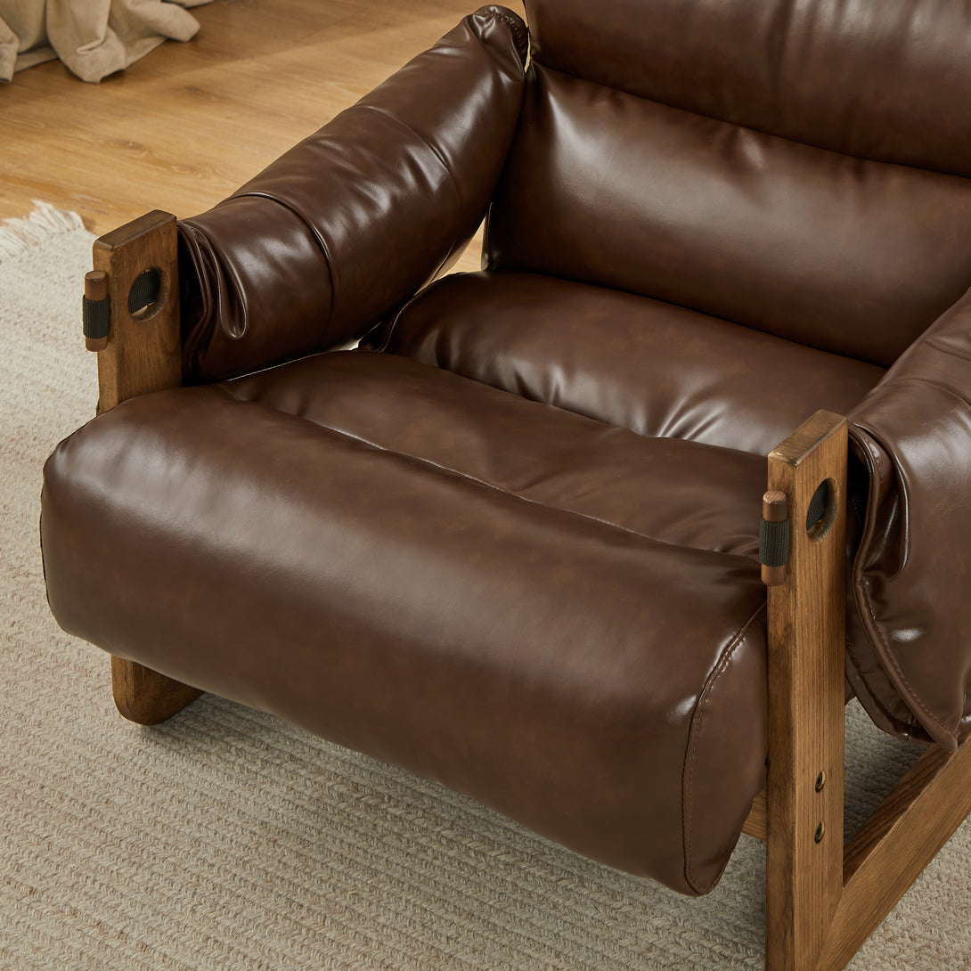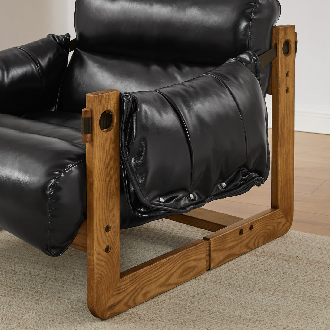 Art Leon Solid Ash Wood Leisure Chair, Top-Grain Leather Lounge Sofa with Strapped-on Cushions