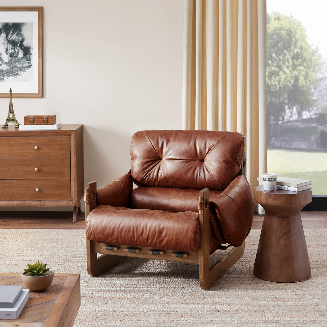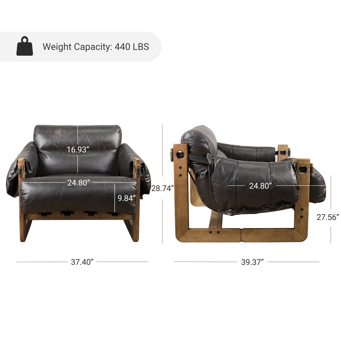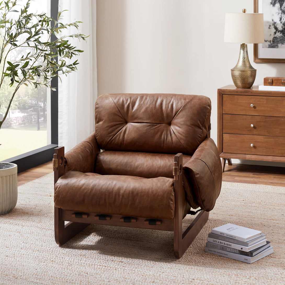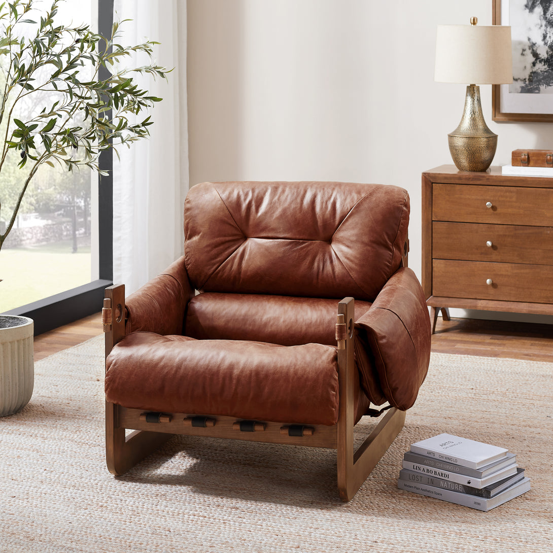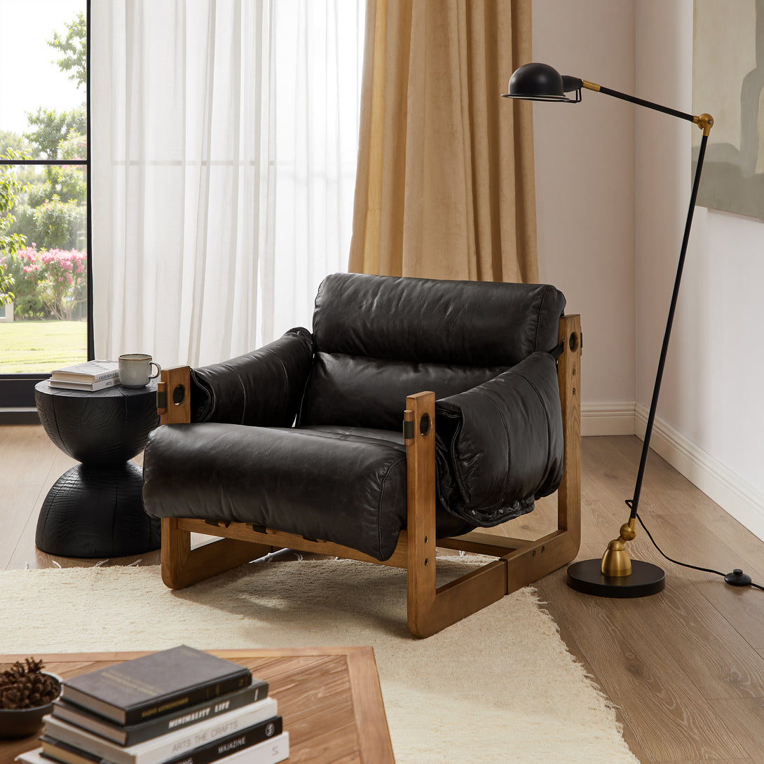 Introducing an exquisite lounge chair that combines timeless elegance with classic craftsmanship! This low-profile accent armchair is upholstered with top-grain leather, which is both breathable and delicate, and features a solid wood frame for strong support & longevity.