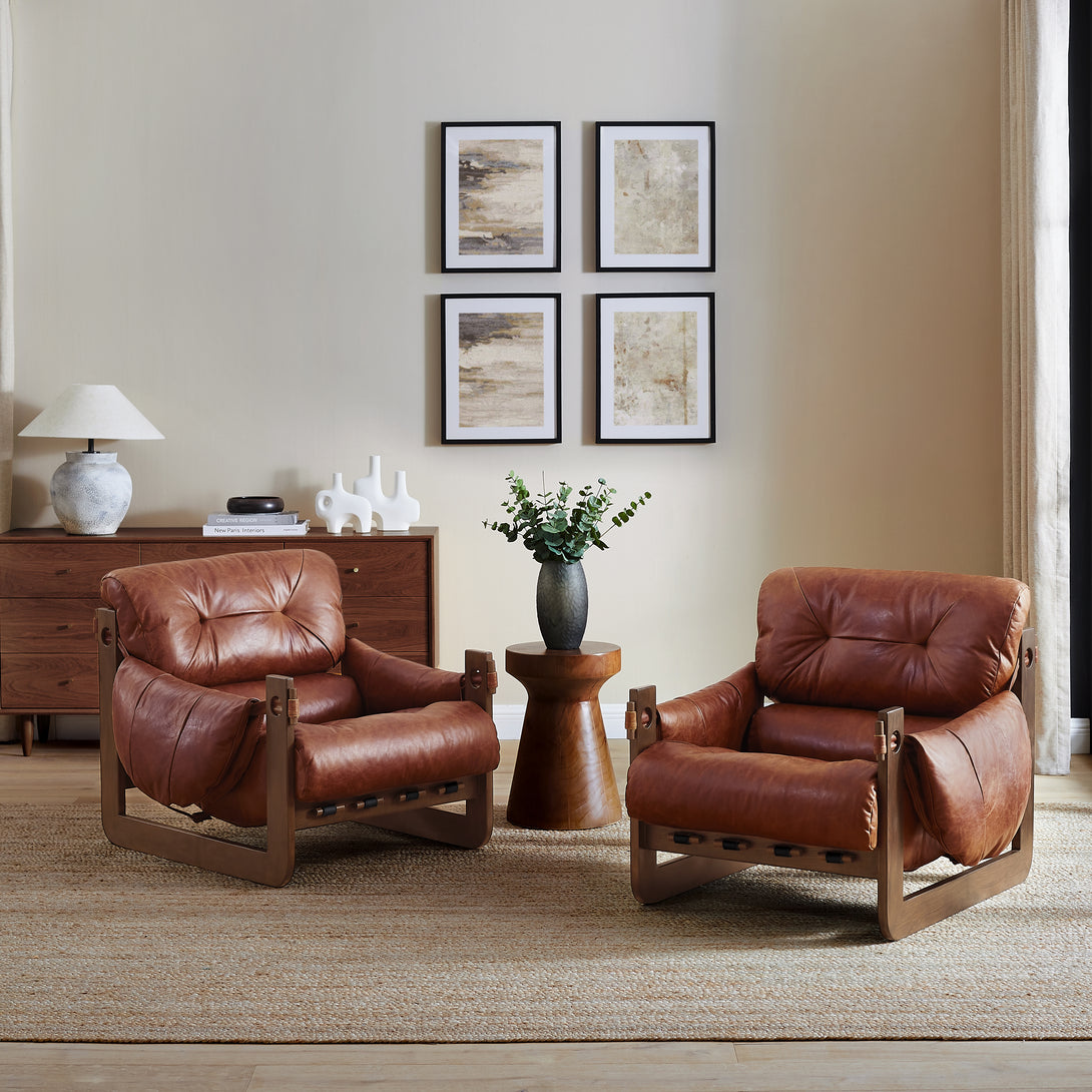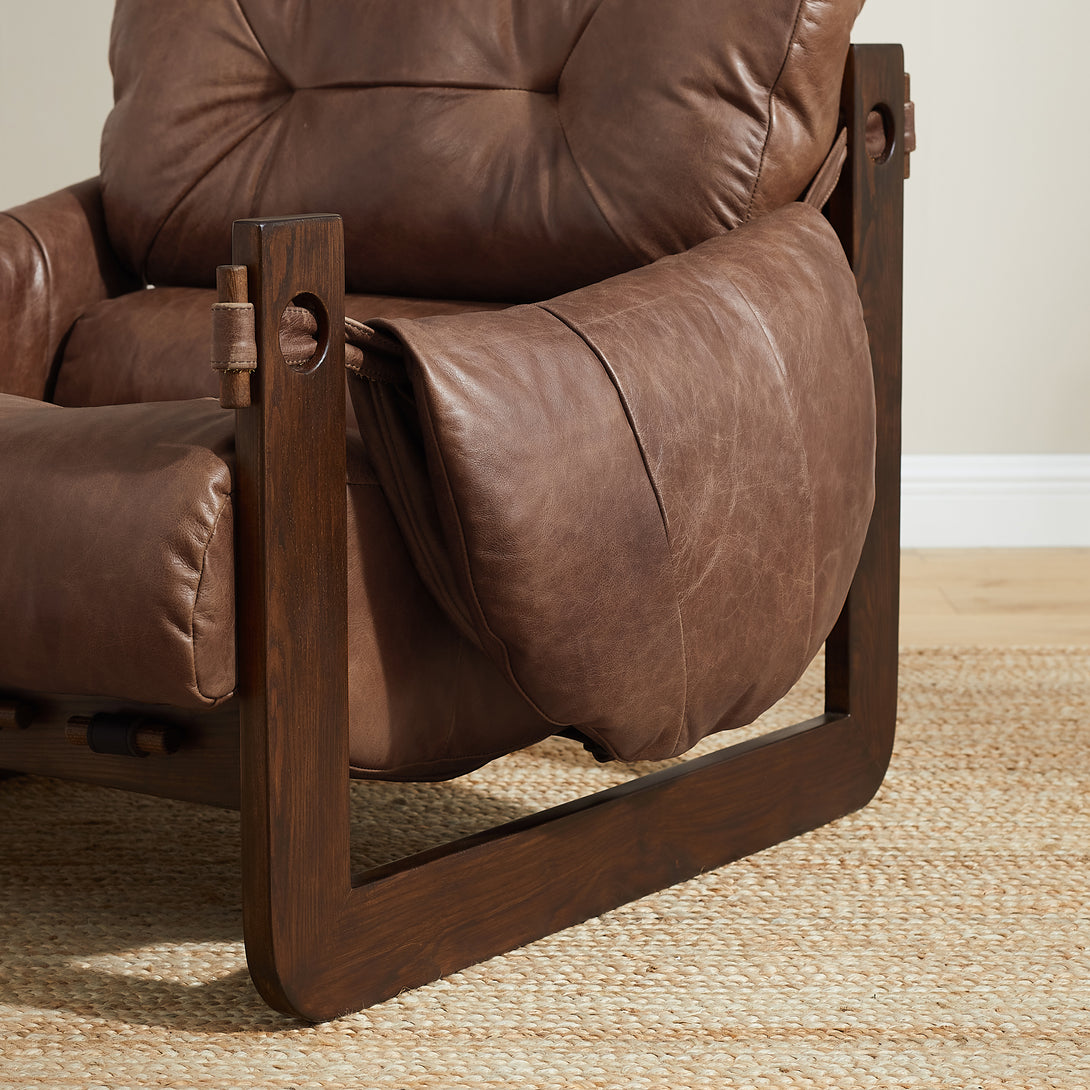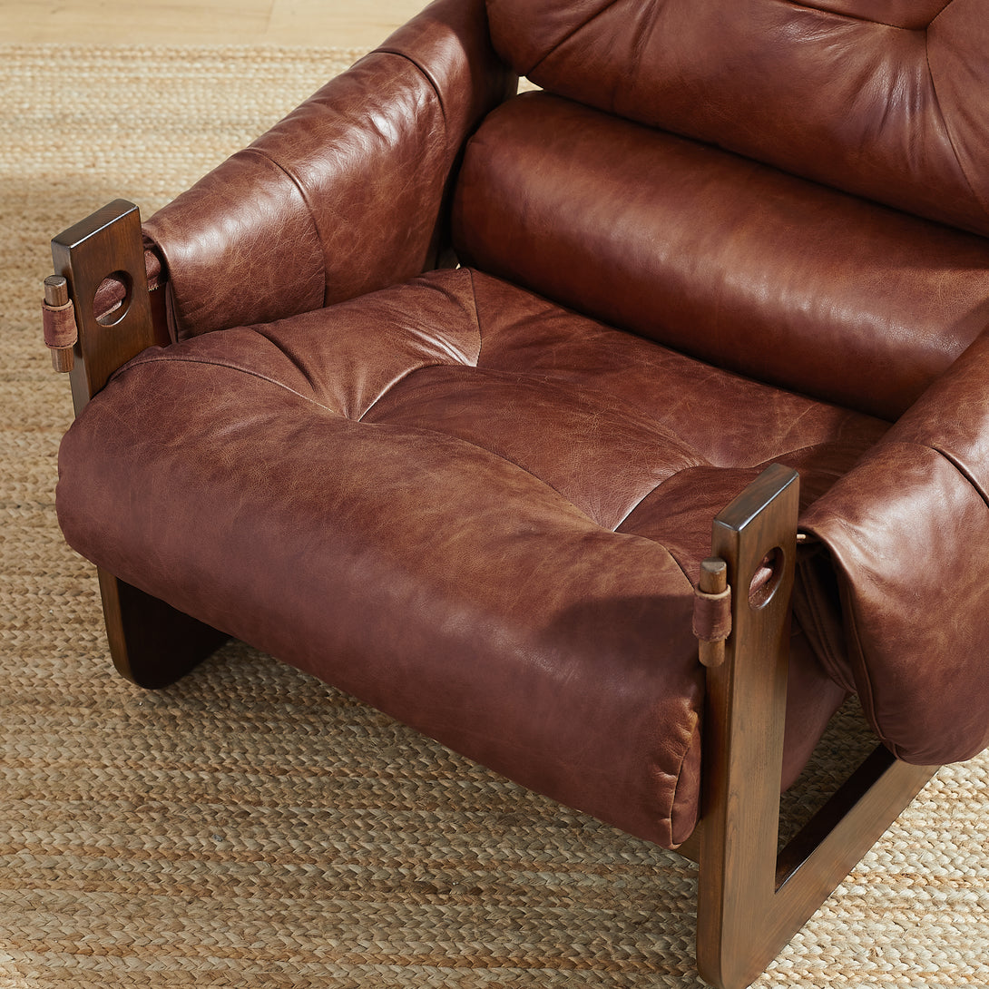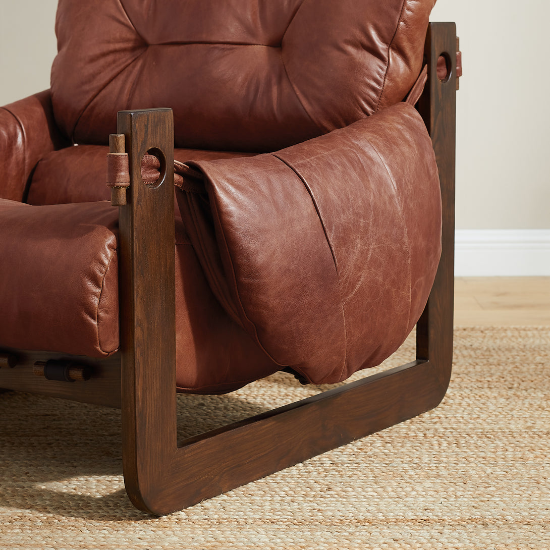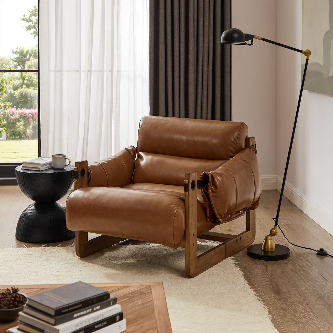 Introducing an exquisite lounge chair that combines timeless elegance with classic craftsmanship! This low-profile accent armchair is upholstered with top-grain leather, which is both breathable and delicate, and features a solid wood frame for strong support & longevity.